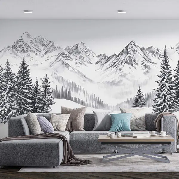 Fotomurales Montaña nevada con árboles y montañas al fondo
