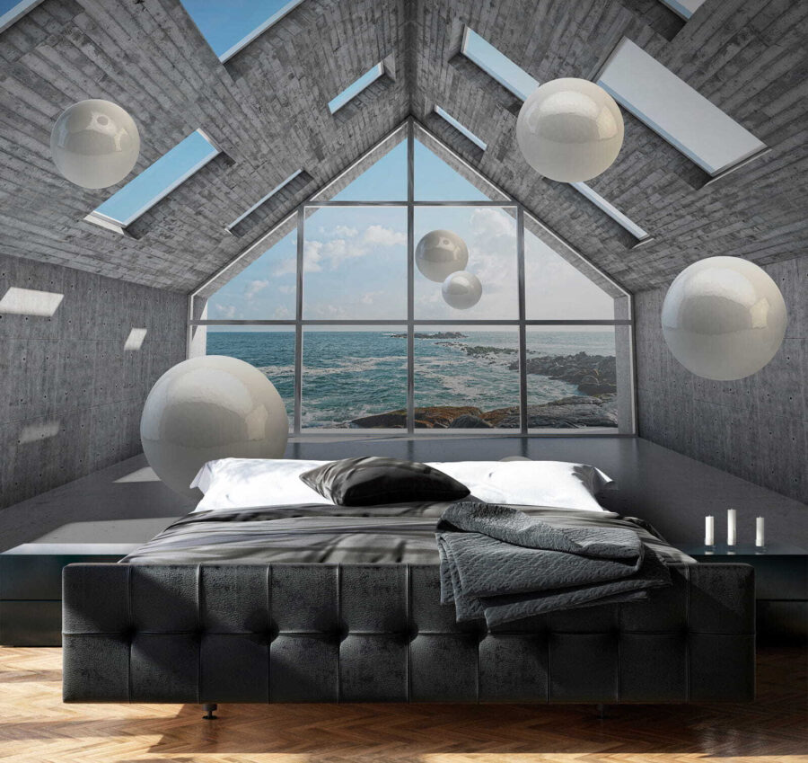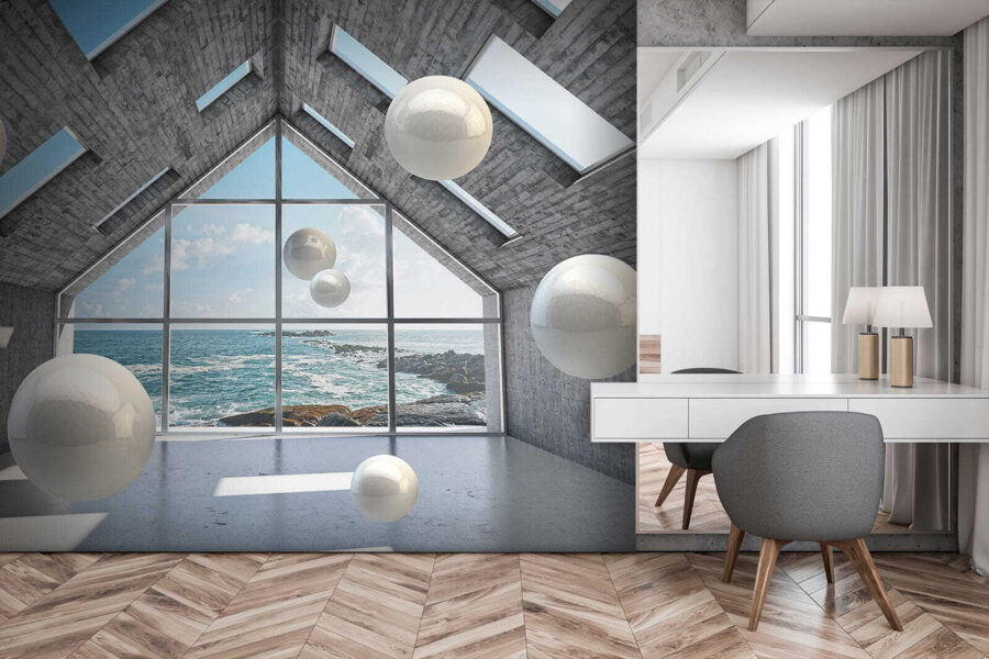 Transforme su espacio en una escapada de ensueño con este mural de una esfera blanca flotando en una habitación de hormigón. Es como entrar en una instalación de arte sin salir de casa. Imagínese tomando un café, sumido en sus pensamientos, mientras esas elegantes esferas parecen danzar a su alrededor. La mezcla del aspecto moderno e industrial con la fascinante vista del mar crea una atmósfera relajante. Es perfecto para despertar la creatividad o simplemente para tomarse un momento para respirar. Ya sea en un acogedor salón o en un elegante despacho, este mural invita a la curiosidad y a la conversación, haciendo que cualquier pared cobre vida. ¡Siente el ambiente!