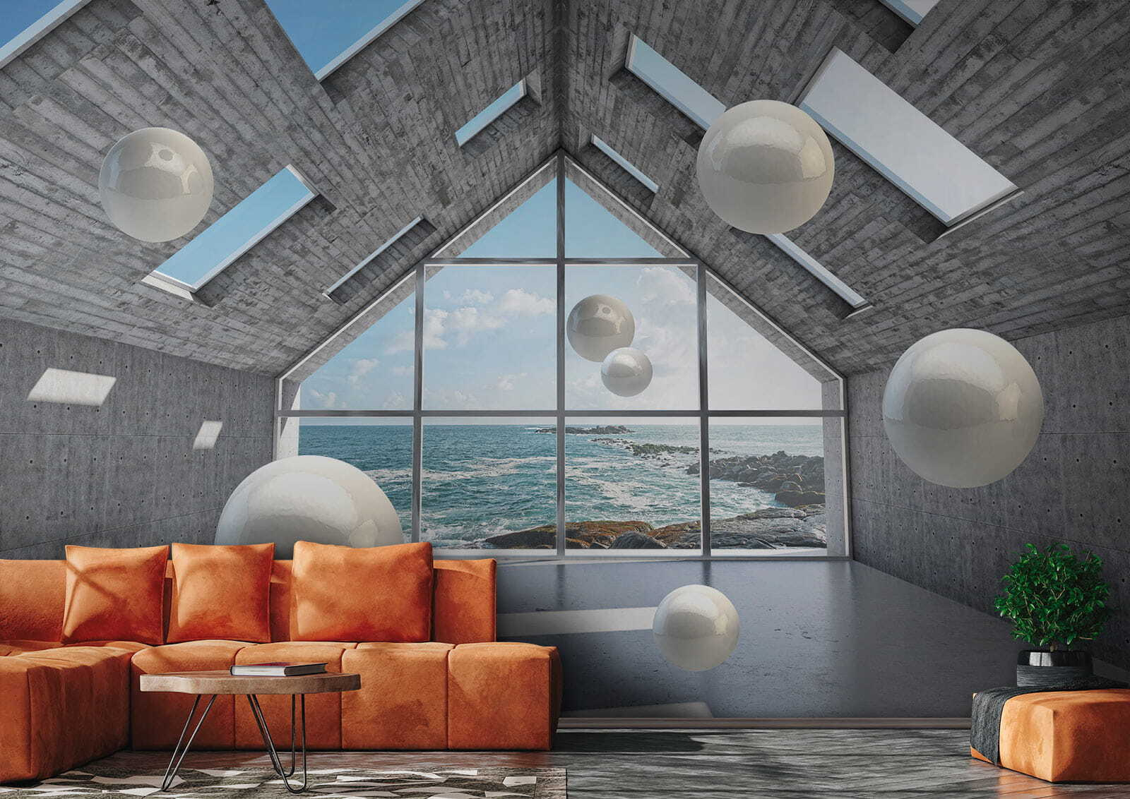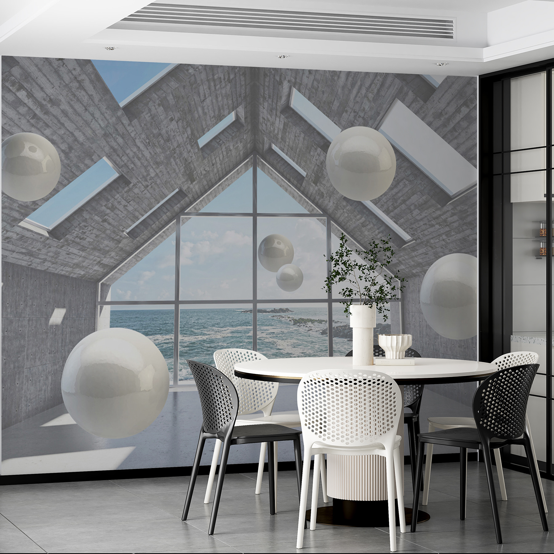 Transforme su espacio en una escapada de ensueño con este mural de una esfera blanca flotando en una habitación de hormigón. Es como entrar en una instalación de arte sin salir de casa. Imagínese tomando un café, sumido en sus pensamientos, mientras esas elegantes esferas parecen danzar a su alrededor. La mezcla del aspecto moderno e industrial con la fascinante vista del mar crea una atmósfera relajante. Es perfecto para despertar la creatividad o simplemente para tomarse un momento para respirar. Ya sea en un acogedor salón o en un elegante despacho, este mural invita a la curiosidad y a la conversación, haciendo que cualquier pared cobre vida. ¡Siente el ambiente!