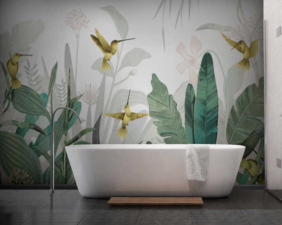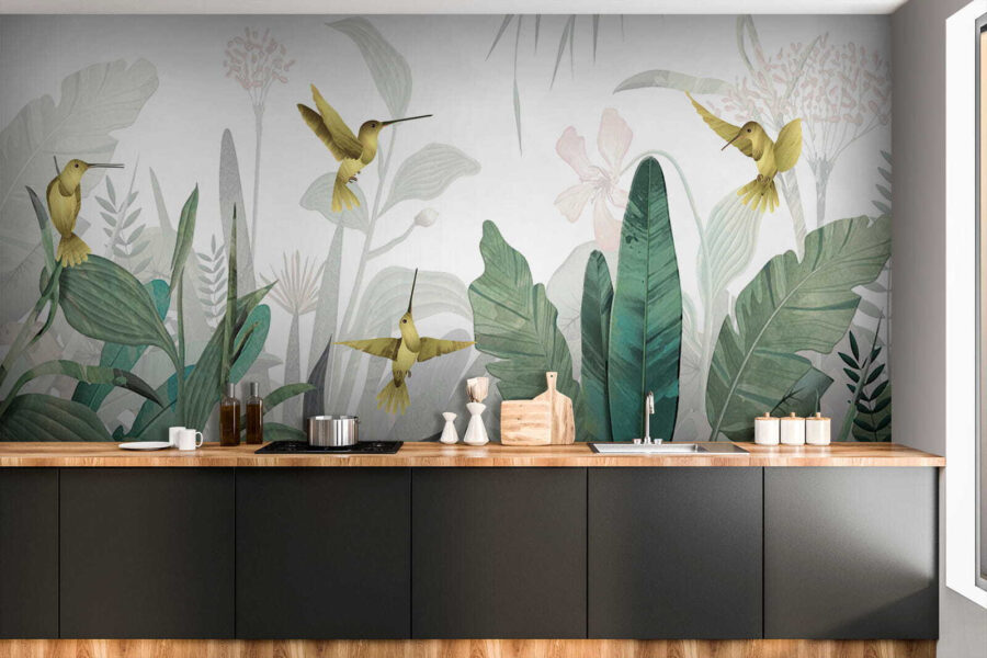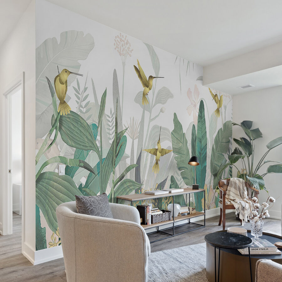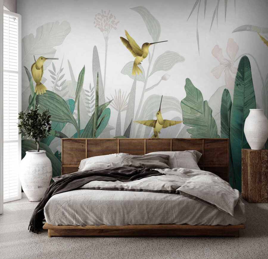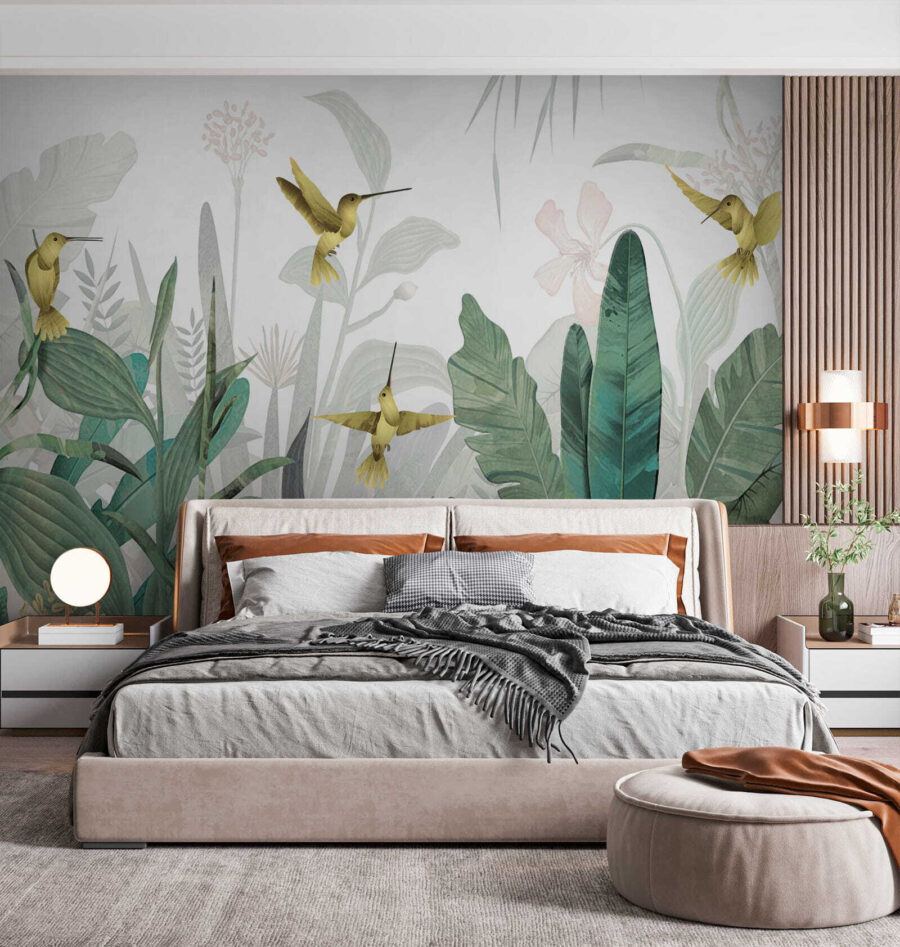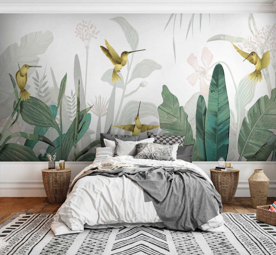 Imagínese entrar en una habitación y sentir que acaba de entrar en un exuberante paraíso selvático: colibríes revoloteando, follaje vibrante a su alrededor. Eso es lo que este mural “Colibríes revolotean en medio de un exuberante follaje” hace a un espacio. Es como tener un trocito de paraíso tropical en la pared.