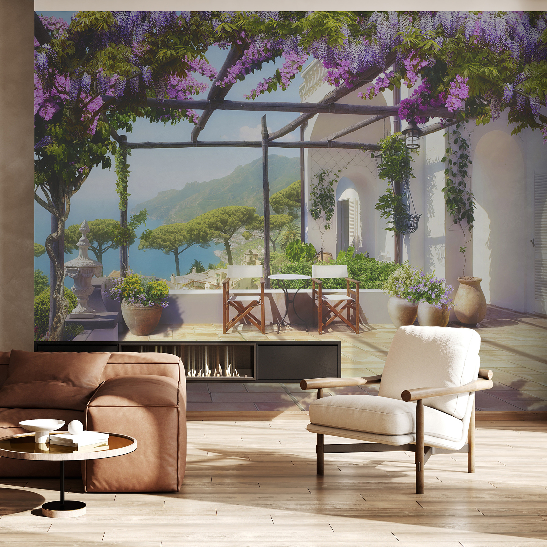 Perfecto para iluminar cualquier espacio, este mural combina la arquitectura clásica con la belleza de la naturaleza. Casi oirá el suave susurro de las hojas y sentirá una cálida brisa. Ya sea en el salón o en el rincón de una acogedora cafetería, este mural aporta un ambiente acogedor y sereno… casi como si te hubieras trasladado a tu escapada costera favorita. Esas macetas de terracota, llenas de flores de colores, añaden el toque perfecto de encanto.