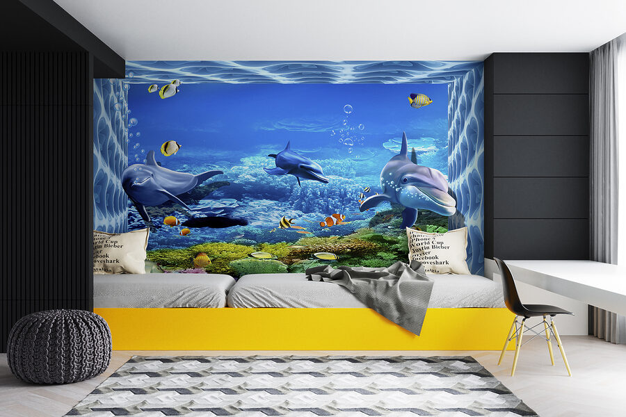 Sumérjase en un vibrante mundo submarino con este encantador mural en el que aparecen delfines nadando graciosamente por aguas centelleantes. Imagina contemplar a estas juguetonas criaturas, rodeadas de peces de colores y exuberantes corales: es como llevar un trozo del paraíso oceánico directamente a tu habitación. Perfecto para espacios infantiles o para cualquiera que sea un niño de corazón, este mural despierta la alegría y la curiosidad. Imagínese las sonrisas que provocará durante las tardes de ocio o las animadas tardes de juego. No es sólo decoración; es una aventura a punto de suceder. ¿Quién no se sentiría un poco más alegre contemplando esta salpicada escena? ¡Decora tus paredes y deja que fluya la diversión!