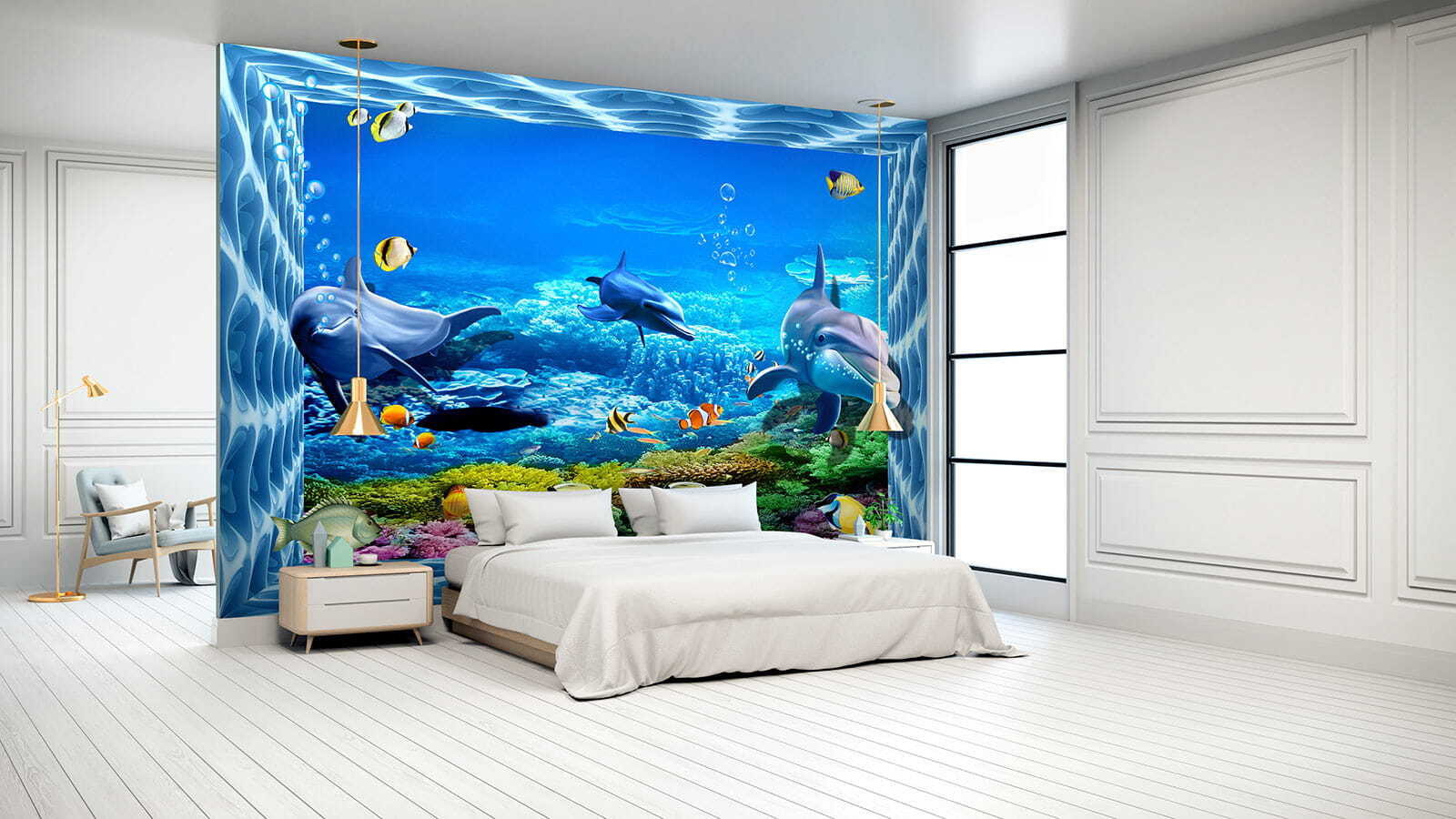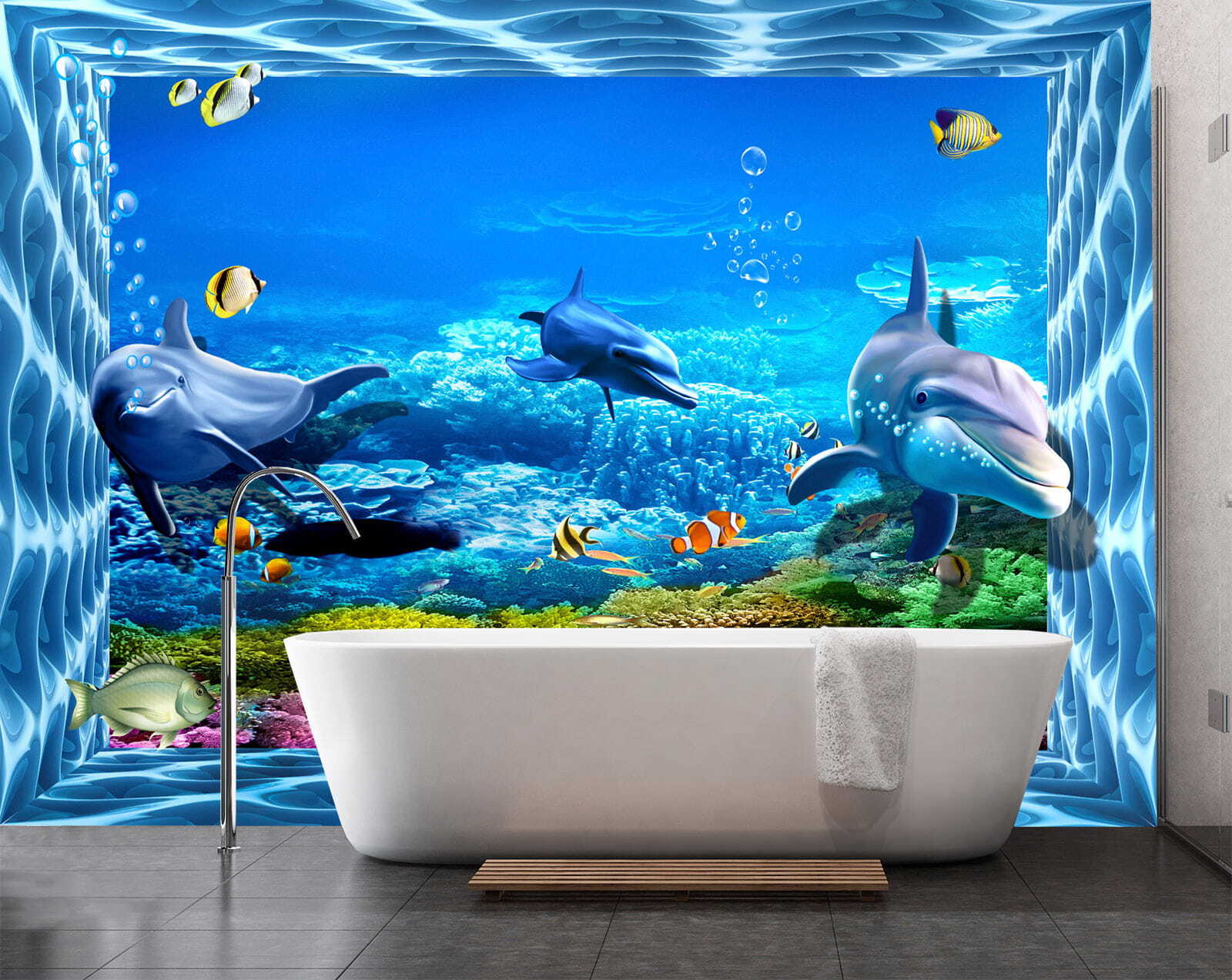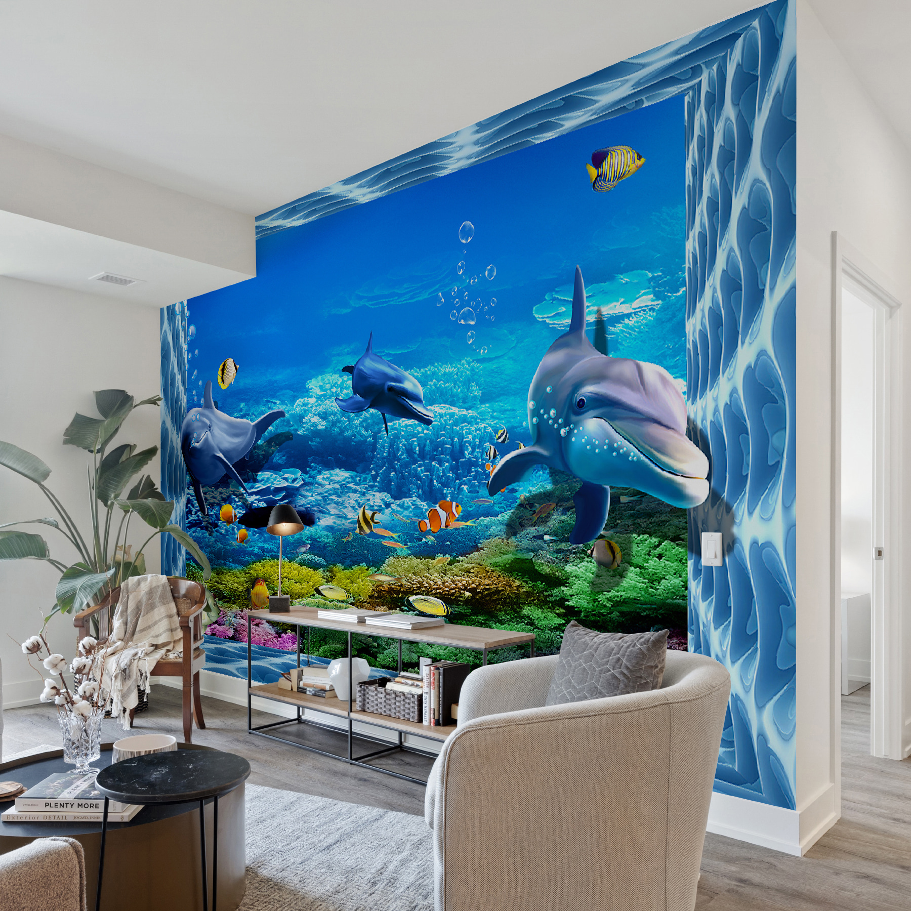 Sumérjase en un vibrante mundo submarino con este encantador mural en el que aparecen delfines nadando graciosamente por aguas centelleantes. Imagina contemplar a estas juguetonas criaturas, rodeadas de peces de colores y exuberantes corales: es como llevar un trozo del paraíso oceánico directamente a tu habitación. Perfecto para espacios infantiles o para cualquiera que sea un niño de corazón, este mural despierta la alegría y la curiosidad. Imagínese las sonrisas que provocará durante las tardes de ocio o las animadas tardes de juego. No es sólo decoración; es una aventura a punto de suceder. ¿Quién no se sentiría un poco más alegre contemplando esta salpicada escena? ¡Decora tus paredes y deja que fluya la diversión!