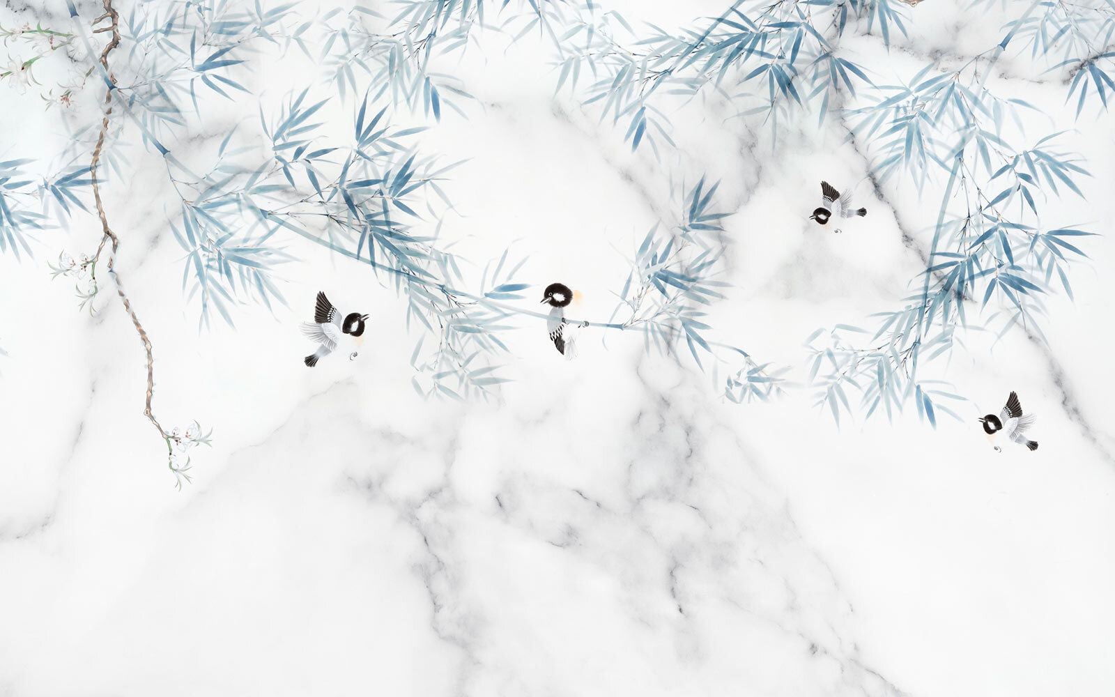 Imagina entrar en un oasis de serenidad en tu salón. Este impresionante mural combina un fondo de mármol blanco con delicadas hojas azules y encantadores pajaritos. Da la sensación de que la naturaleza te susurra secretos al otro lado de la pared. Los colores suaves invitan a la calma, lo que lo hace perfecto para un rincón de lectura acogedor o incluso para una cocina luminosa. Imagina tomarte un café mientras esos pájaros caprichosos parecen revolotear a tu alrededor. Es como un delicioso escape del caos cotidiano, ¿quién no querría eso? Transforma tu espacio en un refugio tranquilo y deja que la belleza de la naturaleza sea tu inspiración diaria.