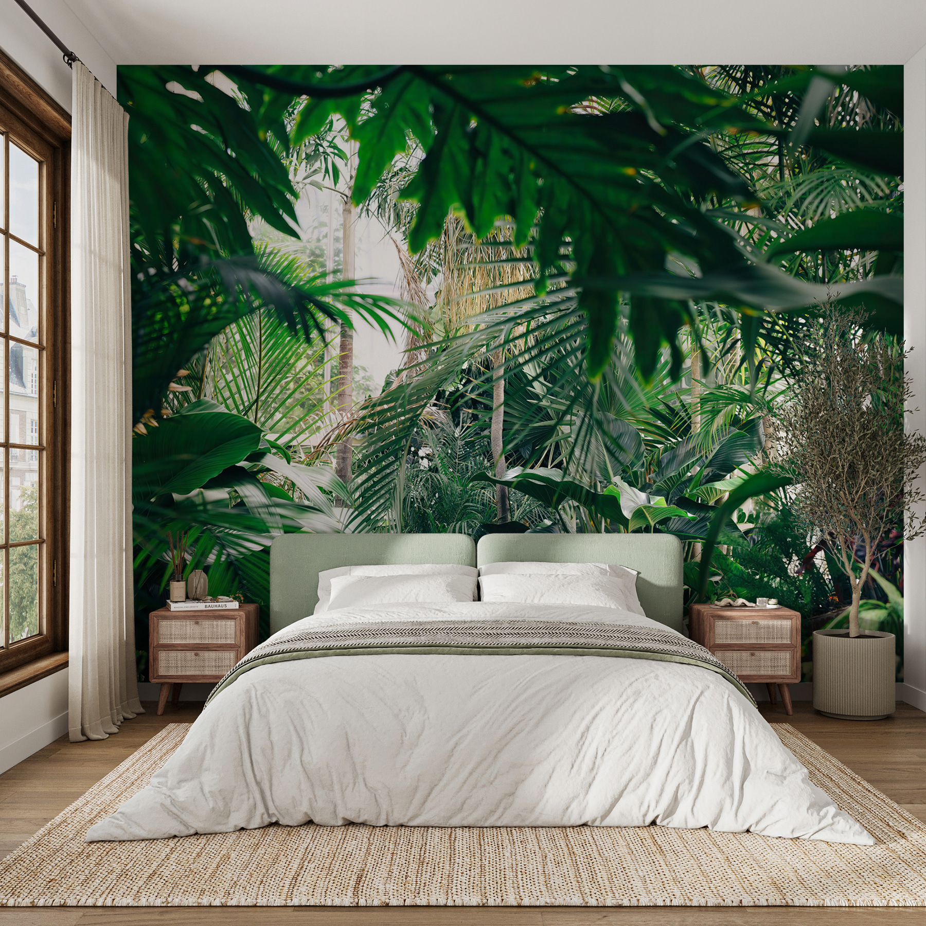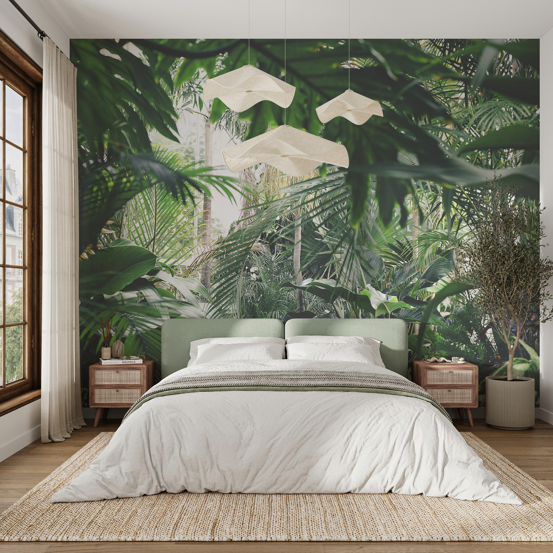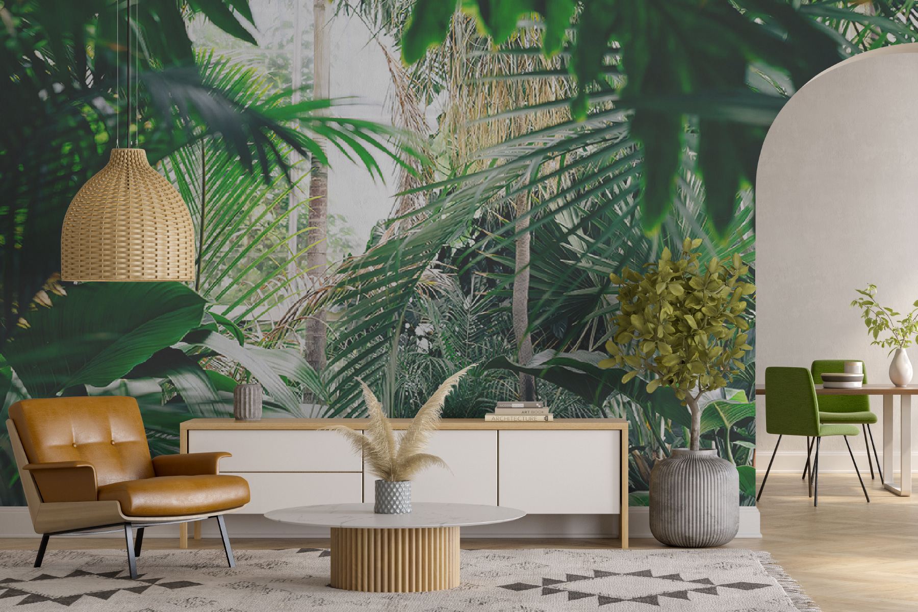 Transforme cualquier habitación en un paraíso tropical con este impresionante mural de exuberante follaje selvático bañado por la luz del sol. Imagínese entrar en su espacio y sentir que ha entrado directamente en una selva serena, donde el aire es fresco y la luz del sol se filtra a través de las hojas. Es como llevar un trozo de naturaleza al interior sin el insecticida. Perfecto para los que anhelan un poco de verdor pero no tienen mano para las plantas. Sus amigos pensarán que ha encontrado el lugar de vacaciones definitivo en su propia casa. Imagínate acurrucado con un buen libro o disfrutando de una taza de café, rodeado de esta vibrante escapada. No es sólo un mural; ¡es un soplo de aire fresco para tus paredes!