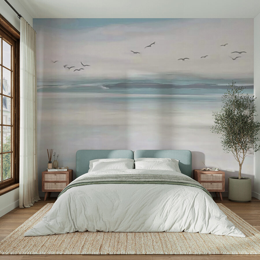 Imagine su espacio transformado por este mural de ensueño, ¡como una suave acuarela que cobra vida! Imagínese “Pájaros volando sobre una masa de agua”, llenando su habitación de serenidad. Es como tener un retiro junto al mar en casa, sin la arena en los zapatos… ¡ni las gaviotas robándote los aperitivos!