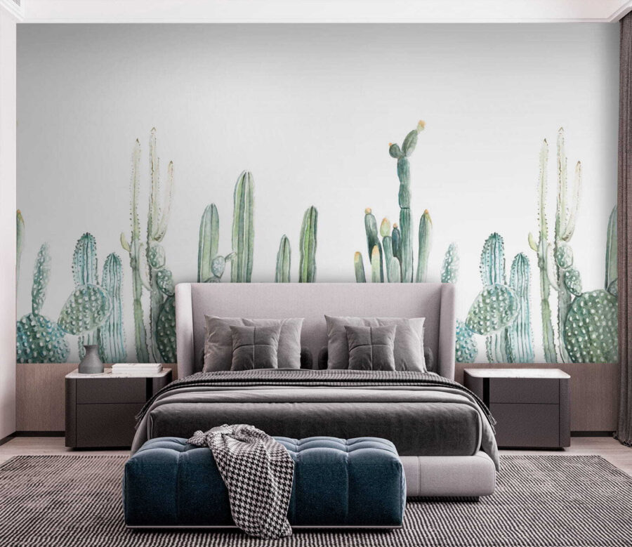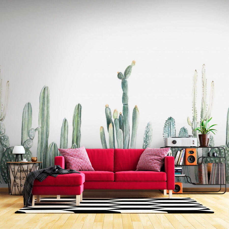 Transforma cualquier habitación en un oasis desértico con este encantador mural que muestra cactus de acuarela en encantadoras hileras. Imagínatelo: entras en tu espacio y, de repente, es como pasear por un jardín sereno, sin necesidad de protección solar. Los verdes suaves y las formas juguetonas aportan una sensación de calma, por lo que es perfecto para un rincón de lectura acogedor o una sala de estar animada. Es casi como tener un cactus de mascota, sin la espinosa rutina de cuidados. Este mural susurra calidez y tranquilidad, invitando a cualquiera que entre a relajarse y descansar. Así que adelante, ¡deje que sus paredes respiren vida!
