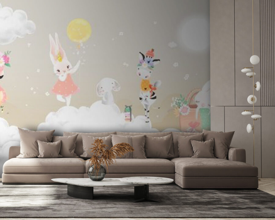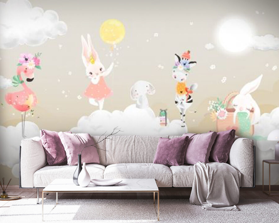 Transforma una pared aburrida en un paraíso de ensueño con este encantador mural que muestra un caprichoso grupo de animales retozando sobre esponjosas nubes. Imagínatelo: un flamenco juguetón, un conejito encantador con un vestido rosa y una cebra con un sombrerito descansando en el cielo como si fueran los dueños del lugar. Este mural aporta un ambiente cálido y alegre que puede despertar la alegría en cualquier habitación, desde un animado cuarto infantil hasta un acogedor rincón de lectura. Es como un abrazo para las paredes, que envuelve los espacios en una sensación de asombro e imaginación. ¿Quién no sonreiría cada vez que pasara por delante? Perfecto para el corazón que ama la decoración única y una pizca de magia.