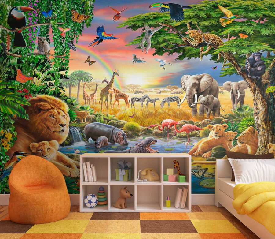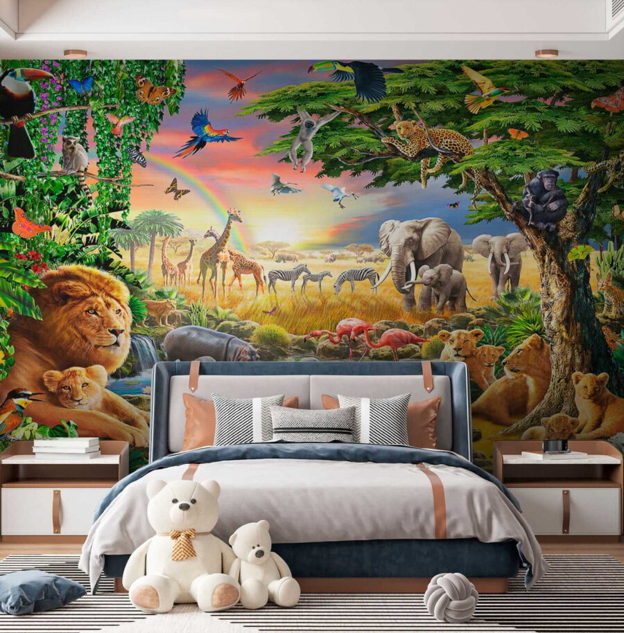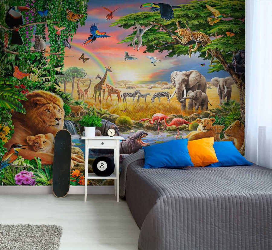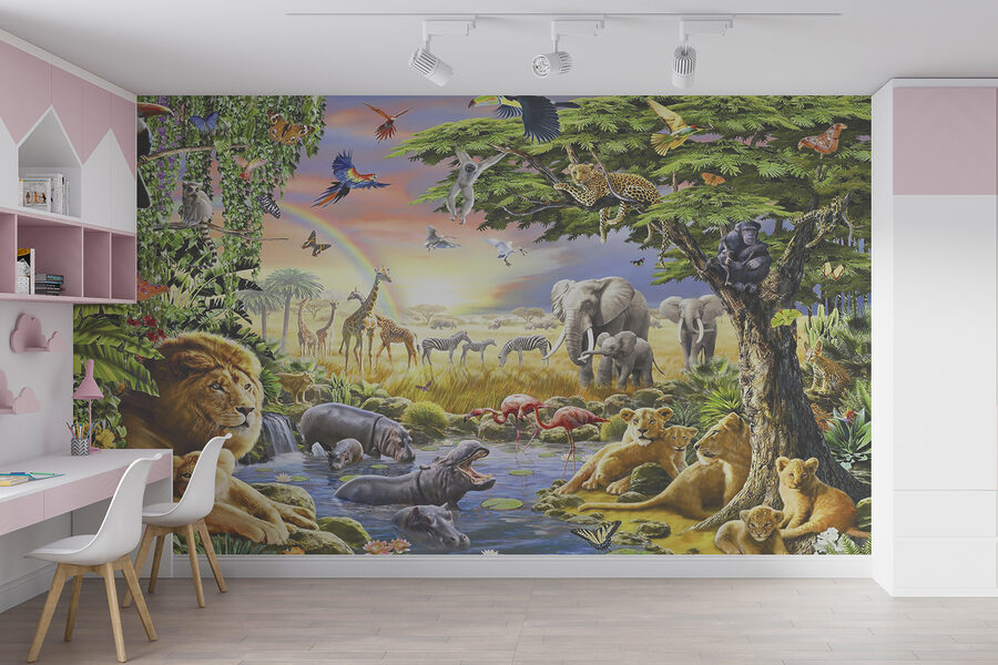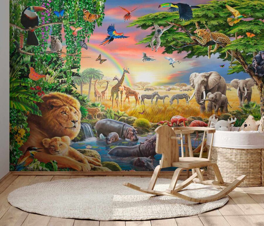 Imagínate entrar en una exuberante sabana en el salón de tu casa: de eso se trata este mural “Los animales de la sabana se reúnen junto al agua”. Es como un mini safari africano con leones descansando, flamencos brincando y elefantes pasando el rato cerca del agua. Imagínatelo: llegas a casa después de un largo día, echas un vistazo a este vibrante mural y ¡bum! Es más que decoración; es una escena llena de vida y color. Es perfecto para añadir un toque de aventura a cualquier habitación: con sólo echarle un vistazo, casi oirás la lejana llamada de la naturaleza. Además, ¿no sería genial para suscitar conversaciones con los amigos? Sin duda, ¡un espectáculo!