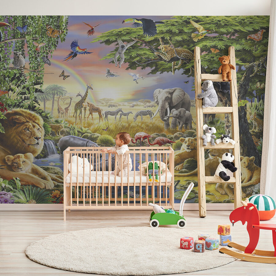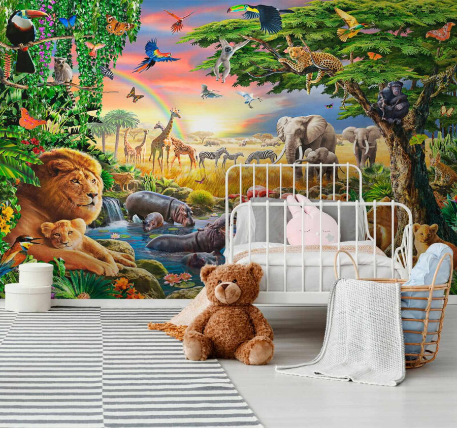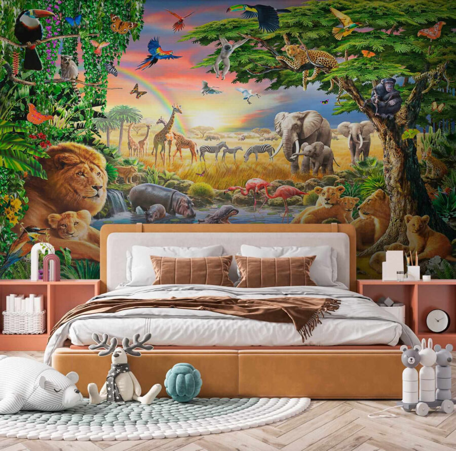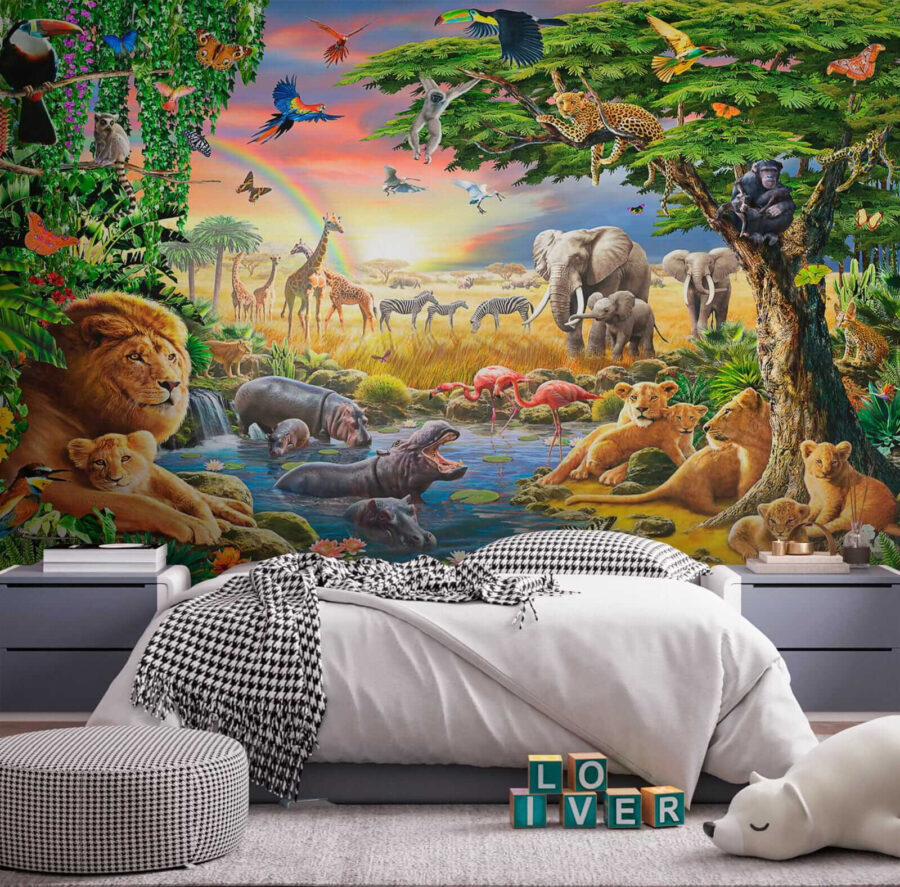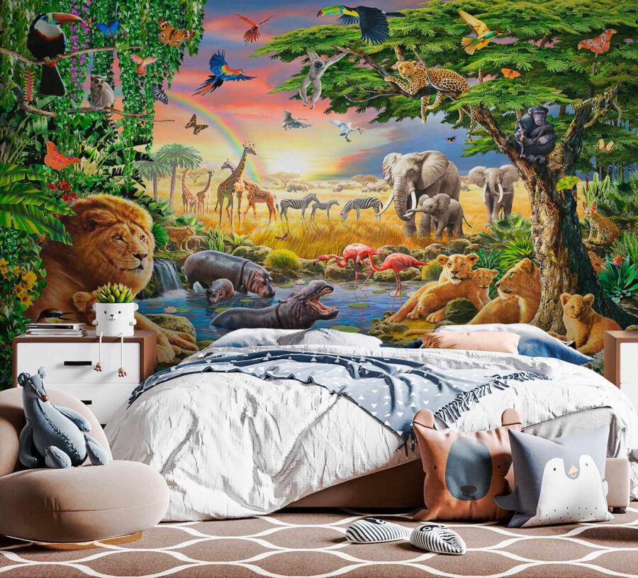 Imagínate entrar en una exuberante sabana en el salón de tu casa: de eso se trata este mural “Los animales de la sabana se reúnen junto al agua”. Es como un mini safari africano con leones descansando, flamencos brincando y elefantes pasando el rato cerca del agua. Imagínatelo: llegas a casa después de un largo día, echas un vistazo a este vibrante mural y ¡bum! Es más que decoración; es una escena llena de vida y color. Es perfecto para añadir un toque de aventura a cualquier habitación: con sólo echarle un vistazo, casi oirás la lejana llamada de la naturaleza. Además, ¿no sería genial para suscitar conversaciones con los amigos? Sin duda, ¡un espectáculo!