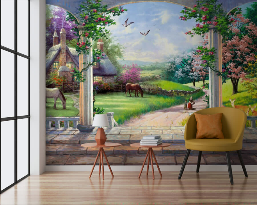 ¡Transforma cualquier habitación en un refugio sereno con este encantador mural! Imagina un paisaje de ensueño donde los caballos pastan tranquilamente y una encantadora cabaña se asoma entre flores vibrantes. Es como entrar en un libro de cuentos, ¡sin necesidad de un portal mágico! Imagina tomarte tu café matutino mientras los pájaros te cantan y los ciervos hacen su aparición fuera. Este mural lleva un toque de naturaleza directamente a tu hogar, haciendo que la vida cotidiana sea un poco más fantástica. Perfecto para crear un ambiente acogedor o para iniciar conversaciones con amigos. ¿Quién necesita unas vacaciones cuando se puede vivir en una obra de arte?