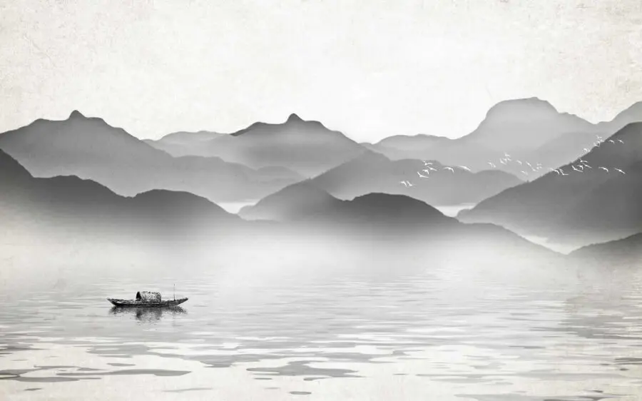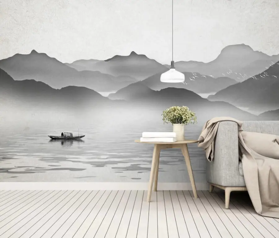 Imagine entering a room and being greeted by a serene scene of a boat gliding across calm waters, with majestic mountains rising in the background. This wall mural transports you to a tranquil escape, where worries seem to drift away like that boat on the glassy surface. The gentle monochrome palette evokes calmness, making it a perfect fit for a cozy reading nook or a relaxing bedroom.