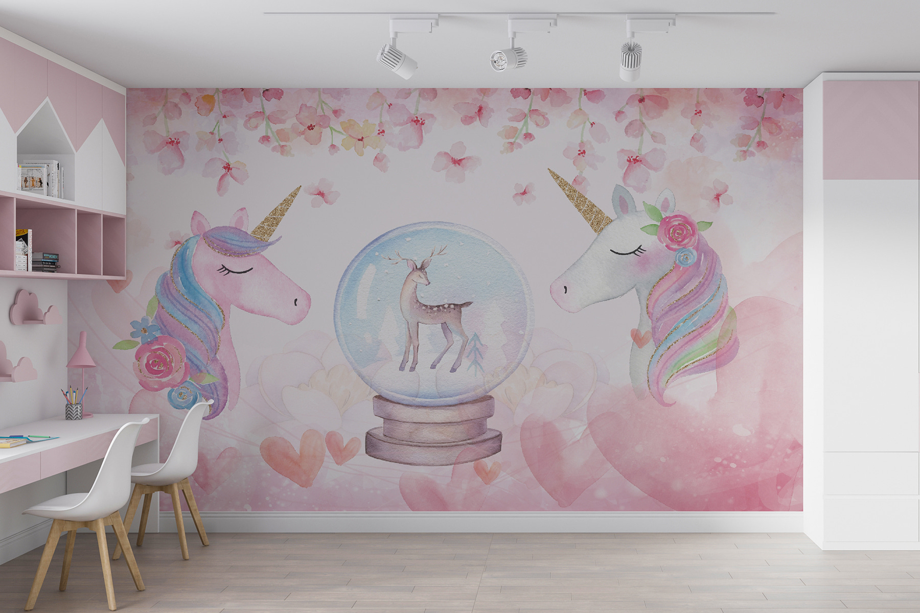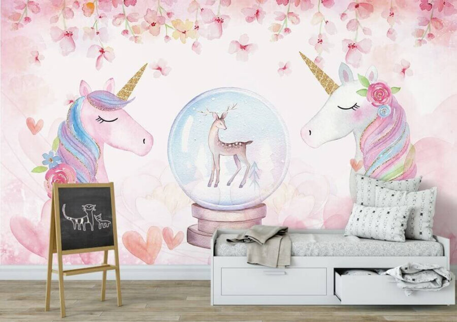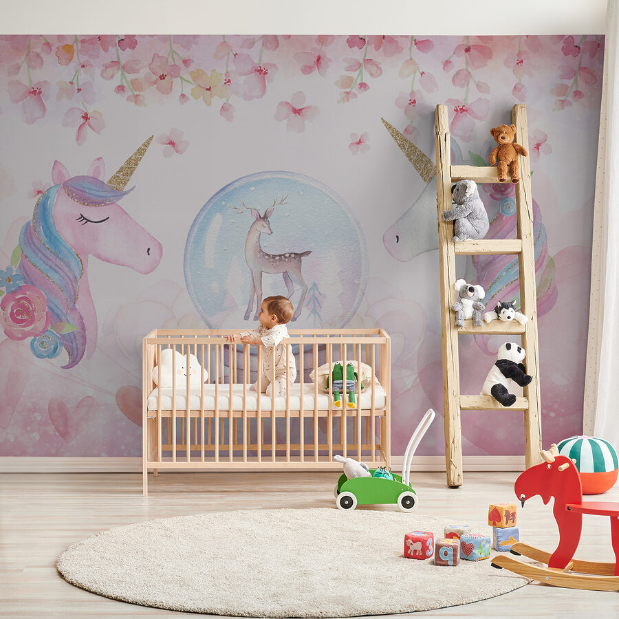 Con tiernos unicornios en medio de suaves tonos florales rosas y un impresionante ciervo en una bola de nieve, este mural parece salido directamente de un cuento de hadas. Los suaves tonos de acuarela son relajantes, mientras que los juguetones detalles inspiran imaginación y fantasía.
