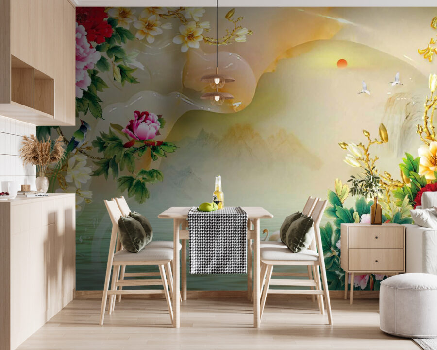 Transforma cualquier espacio en un oasis de tranquilidad con este encantador mural decorativo con flores vibrantes y elegantes cisnes. Las flores de peonía resaltan con su colorido, creando un ambiente alegre, mientras que los serenos cisnes se deslizan sobre una superficie de agua de ensueño, invitando a una relajante tarde de contemplación. Imagina tomarte un té aquí, sintiéndote como si hubieras entrado en una acuarela. Esta pieza es perfecta para paredes decorativas o rincones acogedores, ya que combina sin esfuerzo la belleza de la naturaleza con tu decoración. No es solo arte, es una invitación a hacer una pausa, respirar y disfrutar un poco más de la vida.