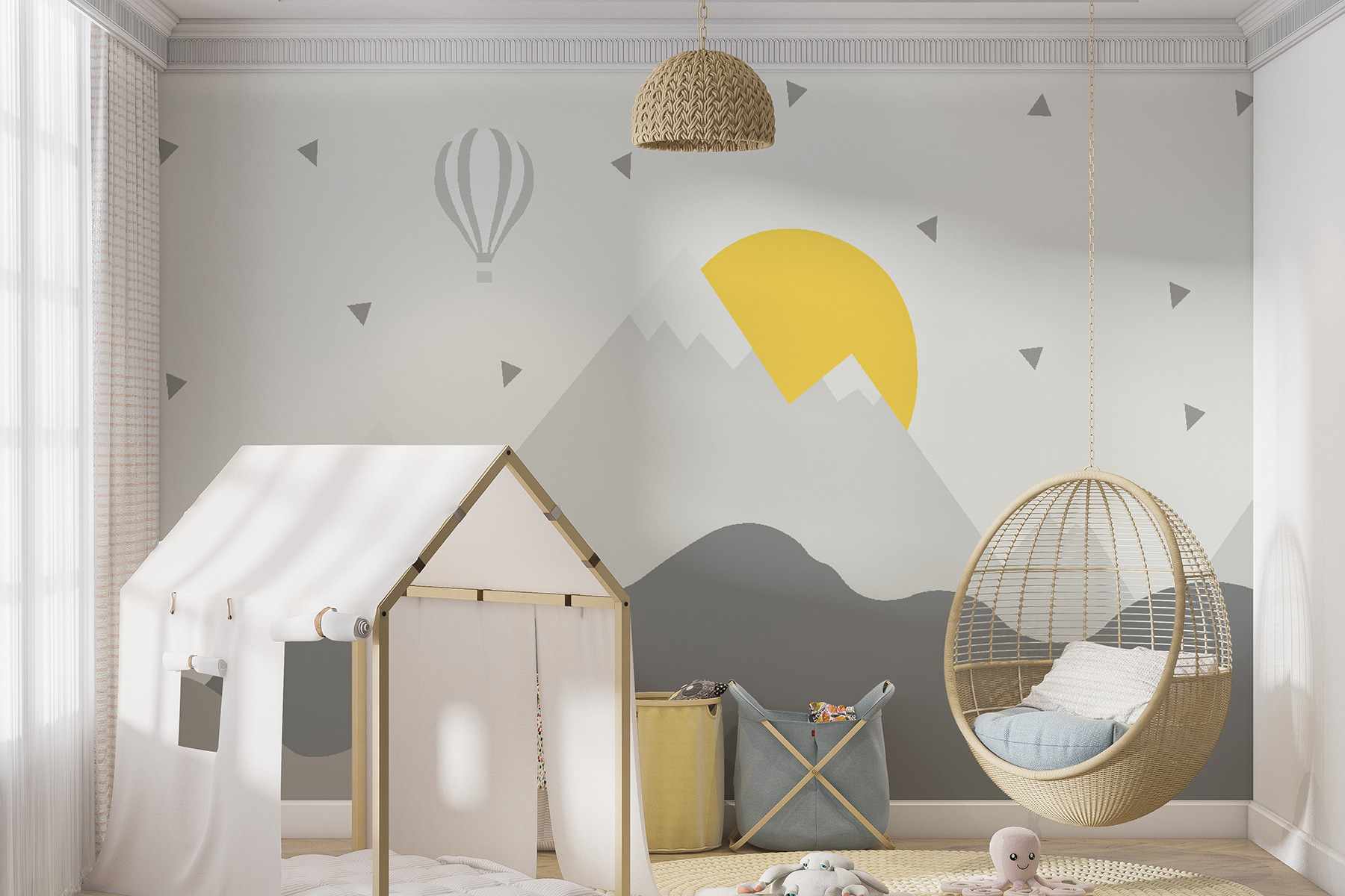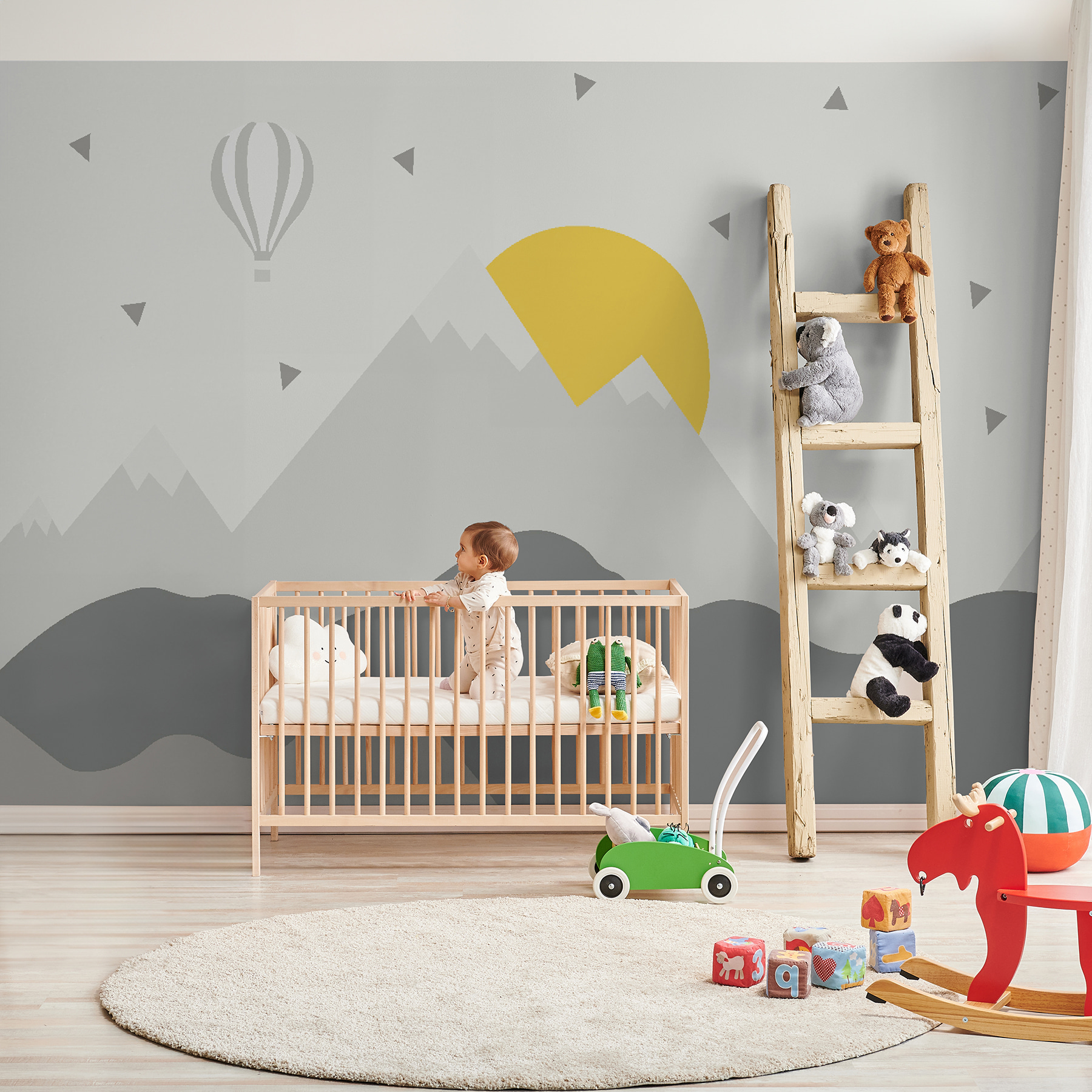 Eche un vistazo a este adorable mural de pared, “Globo aerostático sobre las montañas”, ¡perfecto para decorar la habitación de un niño! Imagínese a su pequeño durmiéndose a la deriva, soñando con elevarse por encima de las altas cumbres y perseguir la puesta de sol. Los colores suaves y el diseño caprichoso son mágicos… tocan la fibra sensible, ¿verdad? Esta pieza no sólo decora una pared, sino que cuenta una historia, una promesa de aventura y asombro. Además, pertenece a nuestras colecciones Murales infantiles y Murales populares, ¡así que ya sabes que será un éxito! Esas suaves montañas de ensueño con el atrevido sol asomando, y ese globo aerostático flotando por encima de todo… Casi parece que fuéramos nosotros los que flotáramos. Este mural no es sólo una decoración, es una pizca de alegría en la vida cotidiana.