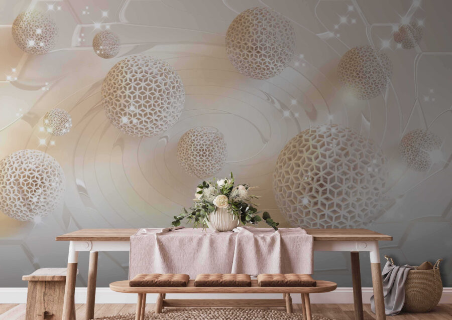 Imagínese entrar en una habitación y sentir que acaba de entrar en un país de las maravillas, de ensueño y brillante. Eso es exactamente lo que hacen los “Murales de pared Esferas abstractas con diseño brillante”: transformar cualquier espacio en algo extraordinario. La mezcla de motivos geométricos y esferas en 3D -¡casi parecen flotar! – combinada con un sutil destello, añade una capa de magia que atrapa todas las miradas.