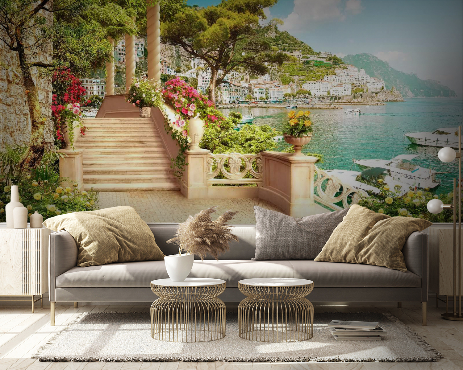 Imagine adentrarse en una escapada serena cada vez que mire este mural. Con sus suaves colores y sus impresionantes vistas de la costa, es como tener una encantadora terraza en casa. Imagínese tomando un café por la mañana aquí, con el sol asomándose entre los árboles y el sonido de las olas susurrando secretos. Las flores añaden ese toque perfecto de vida, invitando a una sonrisa tan cálida como el sol. Sus amigos le preguntarán si se ha ido de vacaciones, pero ¿lo mejor? No hace falta hacer las maletas. Este mural transforma tu espacio sin esfuerzo, llevando ese ambiente de ensueño directamente a tus paredes. ¿Qué más se puede pedir?