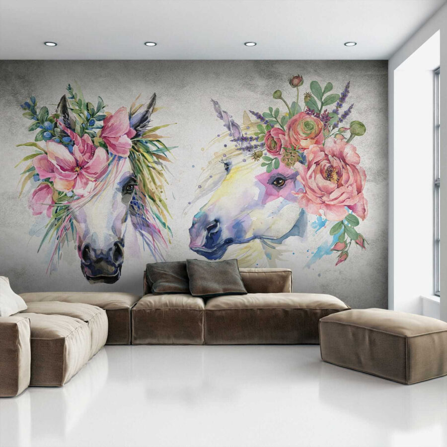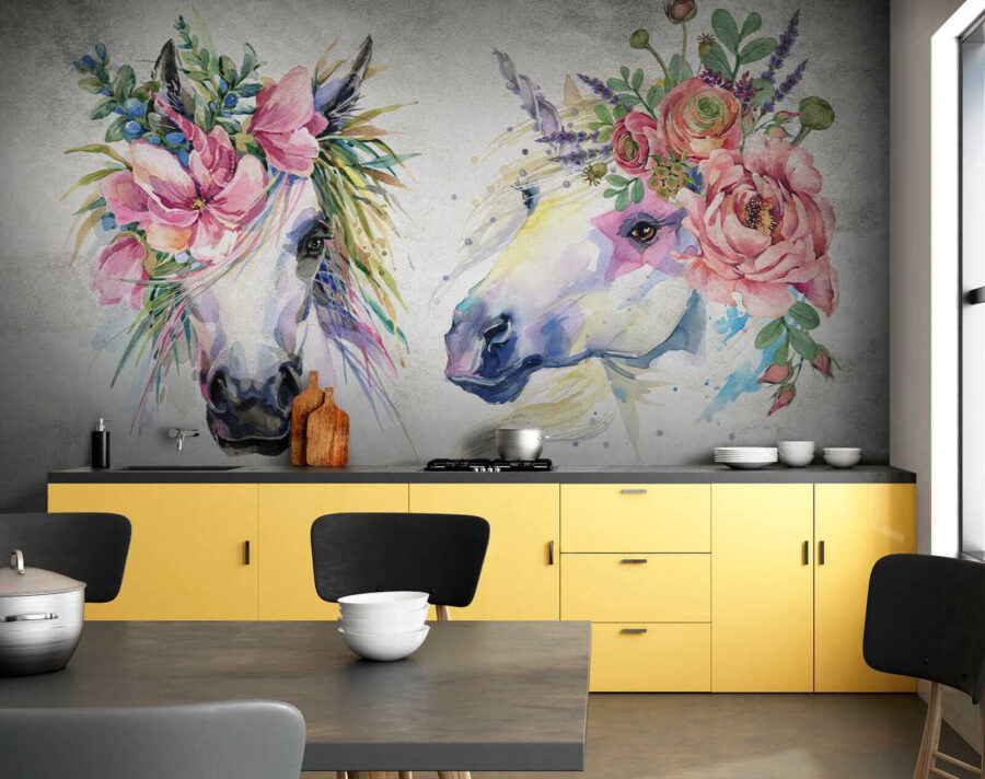Imagínese entrar en una habitación y ser recibido por estos impresionantes caballos adornados con coronas de flores. Este vibrante mural de pared aporta un estallido de color y fantasía a cualquier espacio, perfecto para la habitación de un niño, un cuarto infantil o incluso un estudio creativo. La sensación de acuarela es simplemente de ensueño, casi como si hubieras entrado en un jardín de cuento de hadas. Las delicadas flores y los expresivos ojos de los caballos añaden un toque de magia y serenidad difícil de resistir.