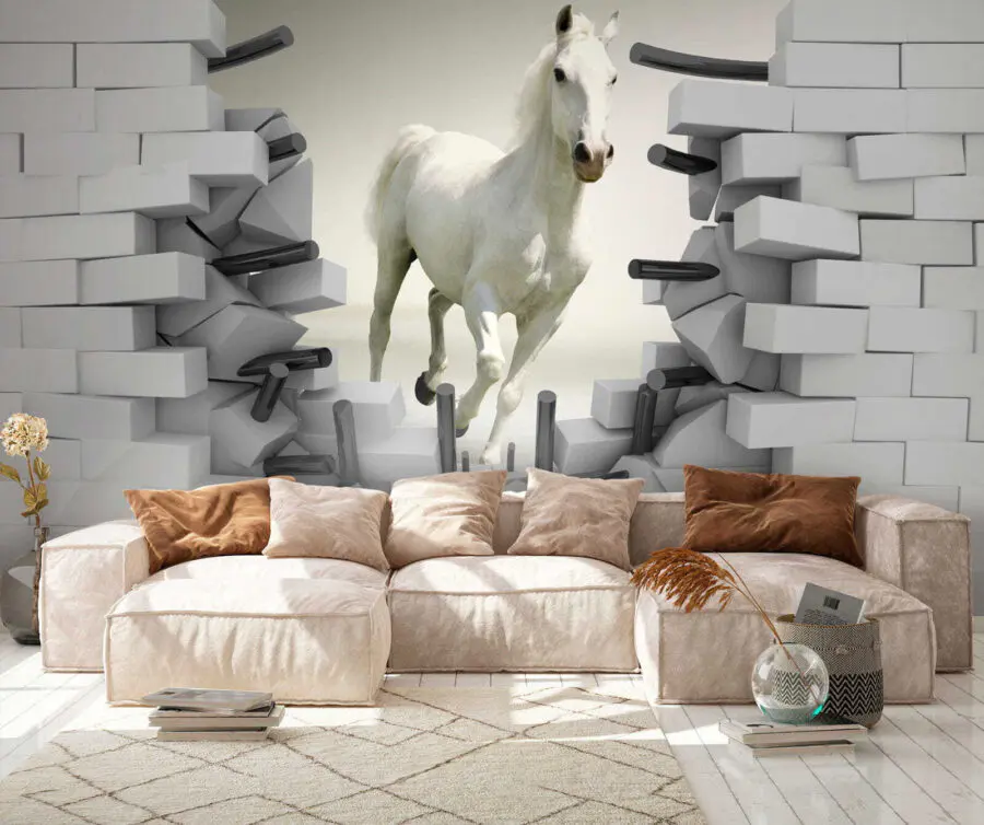 Imagine sentirse como si un semental blanco entrara literalmente galopando en su habitación, ¡a través de la pared! Eso es lo que conseguirá con este impresionante mural de pared. Tiene un increíble efecto 3D que hace que parezca que el caballo está a punto de salir de la obra de arte y entrar directamente en tu habitación. Los niños se quedarán asombrados, pensando que forman parte de una aventura mágica. Y para los adultos, ¡sin duda dará que hablar! Ya sea para una habitación de juegos, una sala de estar original o incluso una oficina creativa, este mural aporta una explosión de energía y un toque de fantasía. Es encantador, atrevido y con la dosis justa de inesperado: ¡simplemente no puede mirarlo sin sonreír!