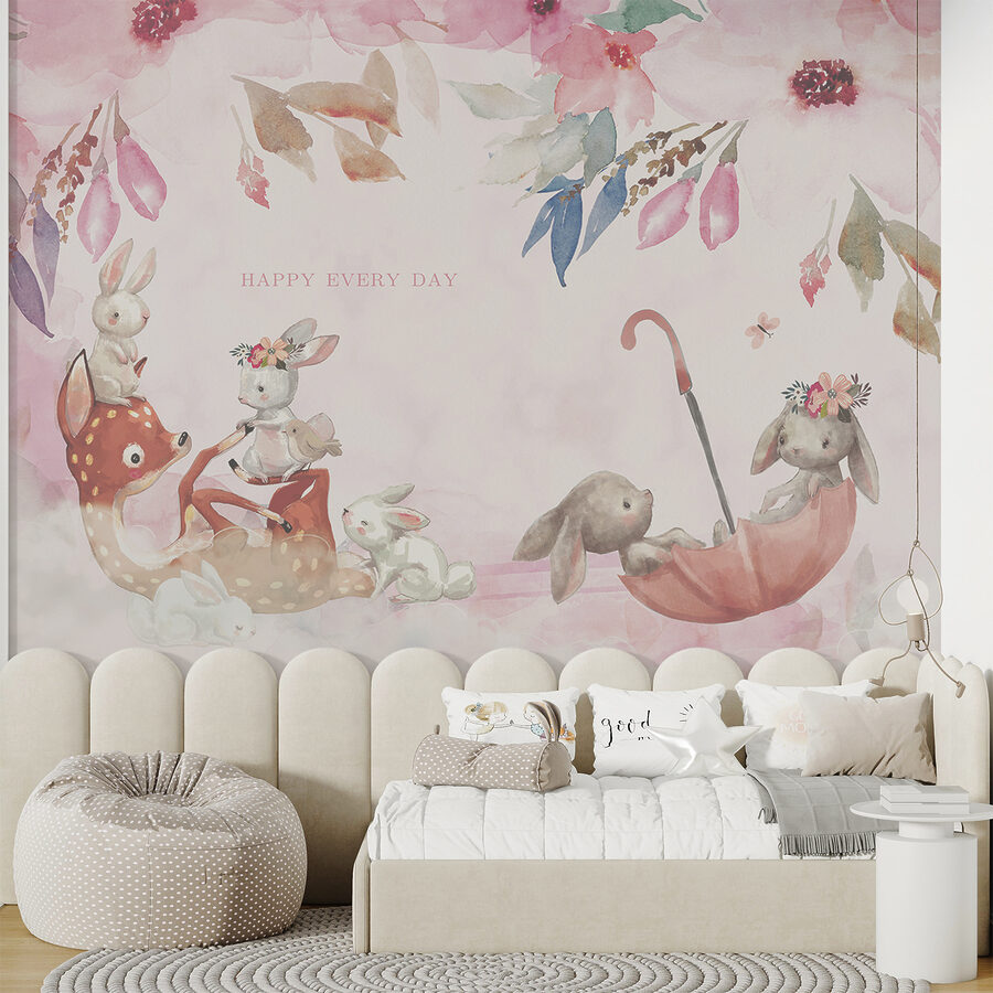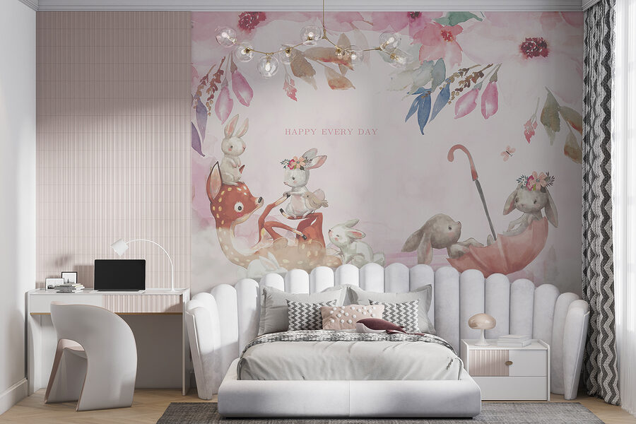 ¿Quieres que la habitación de tu hijo sea absolutamente mágica? Echa un vistazo a este adorable mural “Conejo con flores”. Perfecto para la habitación de una niña, presenta al conejito más mono con flores en la cabeza, como una pequeña princesa del bosque. Imagínatelo: los suaves colores pastel crean un ambiente de ensueño y tranquilidad, haciendo que cada cuento a la hora de dormir sea un poco más caprichoso. Imagina que a tu pequeño se le iluminan los ojos cada vez que lo ve… ¡Pura magia! No es sólo un mural, es una invitación a un mundo de imaginación y risas. Y, ¿quién no querría tener un amigo conejito que le cuide mientras juega y sueña? Este diseño dulce y delicado aportará calidez y alegría a cualquier espacio. Además, es un gran telón de fondo para todas esas fotos familiares que atesorarás para siempre. ¿No te lo imaginas? Tan encantador… ¡tan perfecto!