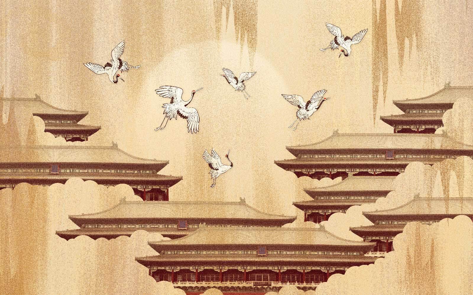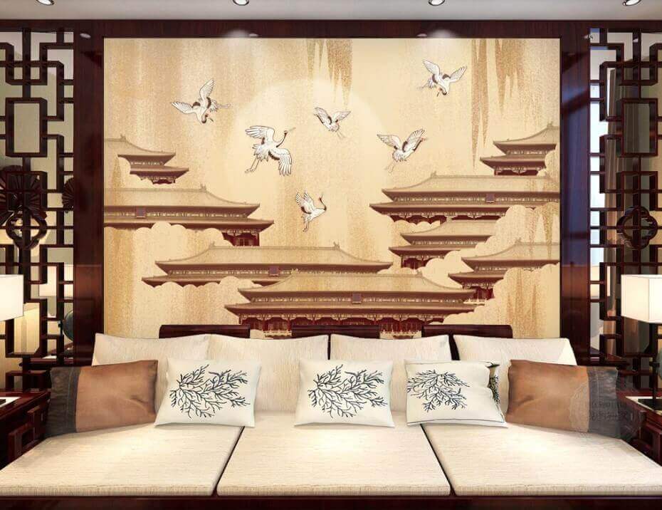 Imagínese entrar en una habitación adornada con este impresionante mural de grullas que planean graciosamente en el cielo. Cada ave parece atrapada en un momento de libertad, planeando sobre elegantes tejados que susurran historias de tierras lejanas. Este mural no sólo decora la pared, sino que transforma todo el espacio, invitando a la paz y la serenidad.