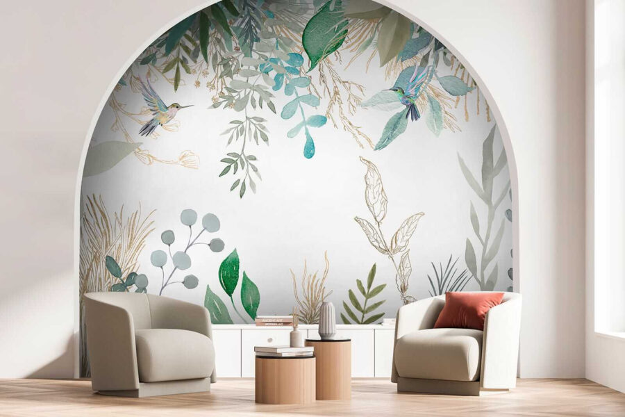 5 valoraciones en Fotomurales Ilustración de colibríes en medio de un exuberante follaje