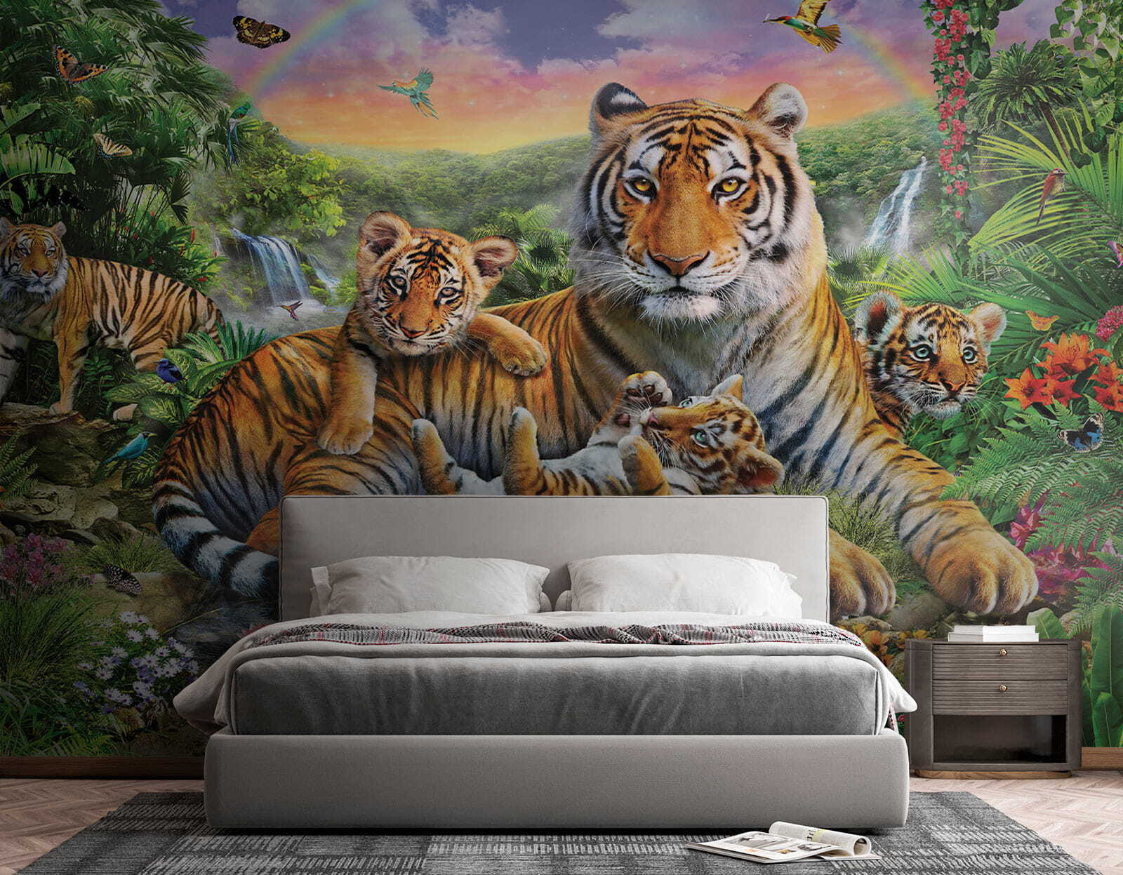 Imagínese entrar en una habitación y ser transportado instantáneamente al corazón de una selva vibrante y exuberante: ¡eso es exactamente lo que hace este “Mural de pared Tigre de pie en una selva”! Con tigres descansando como si estuvieran en unas vacaciones tropicales y cachorros retozando juguetonamente, es como un momento salvaje de National Geographic capturado en su pared. El rico follaje verde, las mariposas revoloteando y los toques de arco iris de fondo crean una escena caprichosa llena de maravillas de la naturaleza. Es perfecto para despertar un poco de aventura en la habitación de un niño o para añadir un toque salvaje a cualquier espacio que necesite un poco de dinamismo. Imagínatelo: tumbado en el sofá, contemplando este mural y casi oyendo las lejanas llamadas de los animales de la selva… ¡Pura magia! Ya sea para los más pequeños o para los jóvenes de corazón, es un trozo de naturaleza salvaje que sin duda despertará la imaginación.