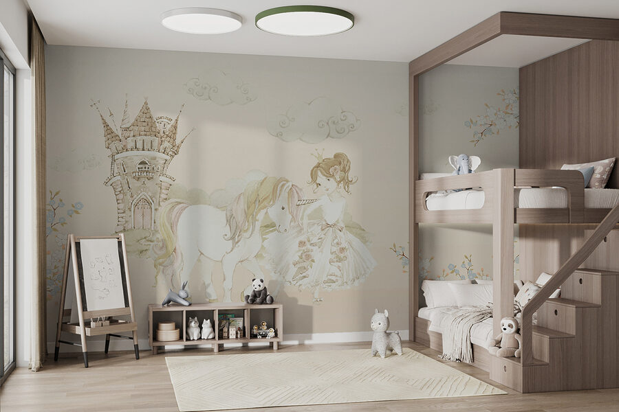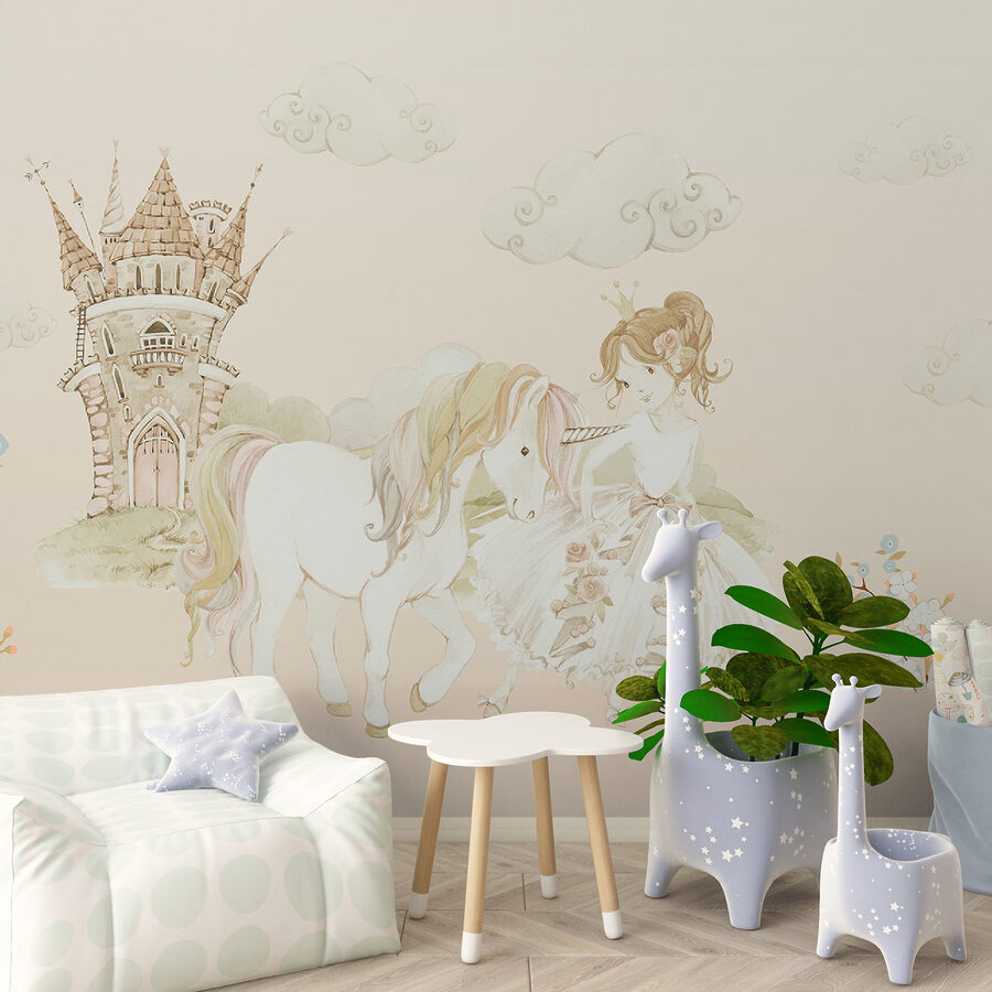 Imagine una pared que le transporte directamente a un caprichoso cuento de hadas: un castillo a lo lejos, una princesa con su fiel unicornio al lado. Este mural es como entrar en una historia de ensueño cada vez que entras en la habitación. Los suaves tonos pastel y los delicados detalles son simplemente… mágicos. Perfecto para la habitación de un niño o de cualquier persona a la que le guste un poco de encanto en su vida. Además, esas nubes esponjosas y esas dulces flores… Harán que cada día parezca un día soleado en un país de cuento de hadas. Una pieza que despierta la imaginación y las sonrisas.