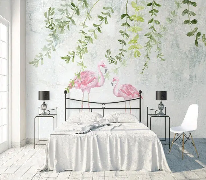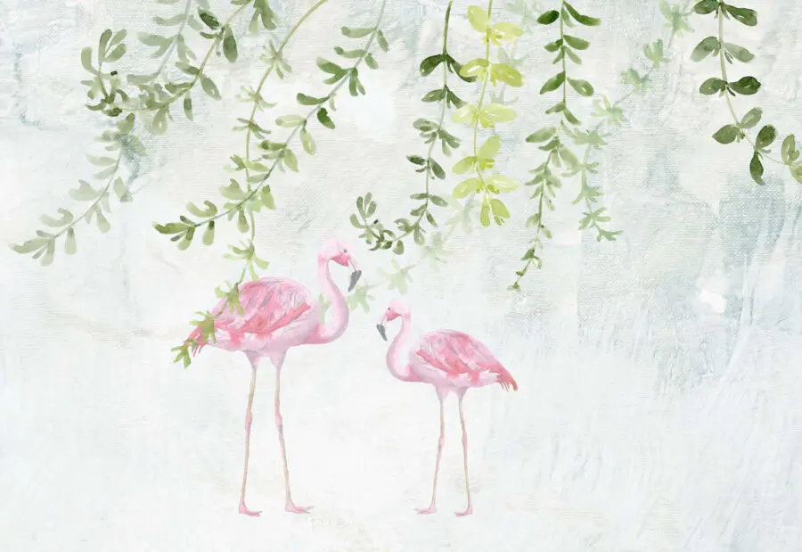 Imagina que entras en una habitación y te recibe este mural de ensueño de dos flamencos relajándose bajo unas frondosas ramas verdes. Tiene un aire relajado de acuarela que es a la vez elegante y un poco juguetón. Perfecto para los amantes de los pájaros o para cualquiera que quiera un toque de color y diversión en su espacio. Piensa: estás tomando el café por la mañana y estos flamencos están ahí, añadiendo un aire sereno, casi tropical. Es como invitar a una obra de arte y a un poco de naturaleza al interior. Sin duda, un tema de conversación para cuando vengan amigos.