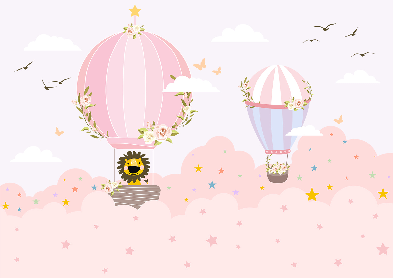 Imagina un mundo en el que caprichosos globos aerostáticos flotan por un cielo de algodón de azúcar y un pequeño león travieso sonríe desde su delicada cesta. Este mural lleva esa visión a tu hogar, envolviendo cualquier habitación en un abrazo de encanto. Perfecto para una guardería o una sala de juegos, despierta la alegría y la imaginación, haciendo que cada día se sienta como una aventura. Los niños pueden pensar que están volando entre las nubes de los sueños. ¿Quién no querría formar parte de esa magia? Con tonos pastel y detalles divertidos, este mural es como una invitación a soñar despierto un poco más. ¡Déjate llevar por la fantasía y deja que el color transforme tu espacio!