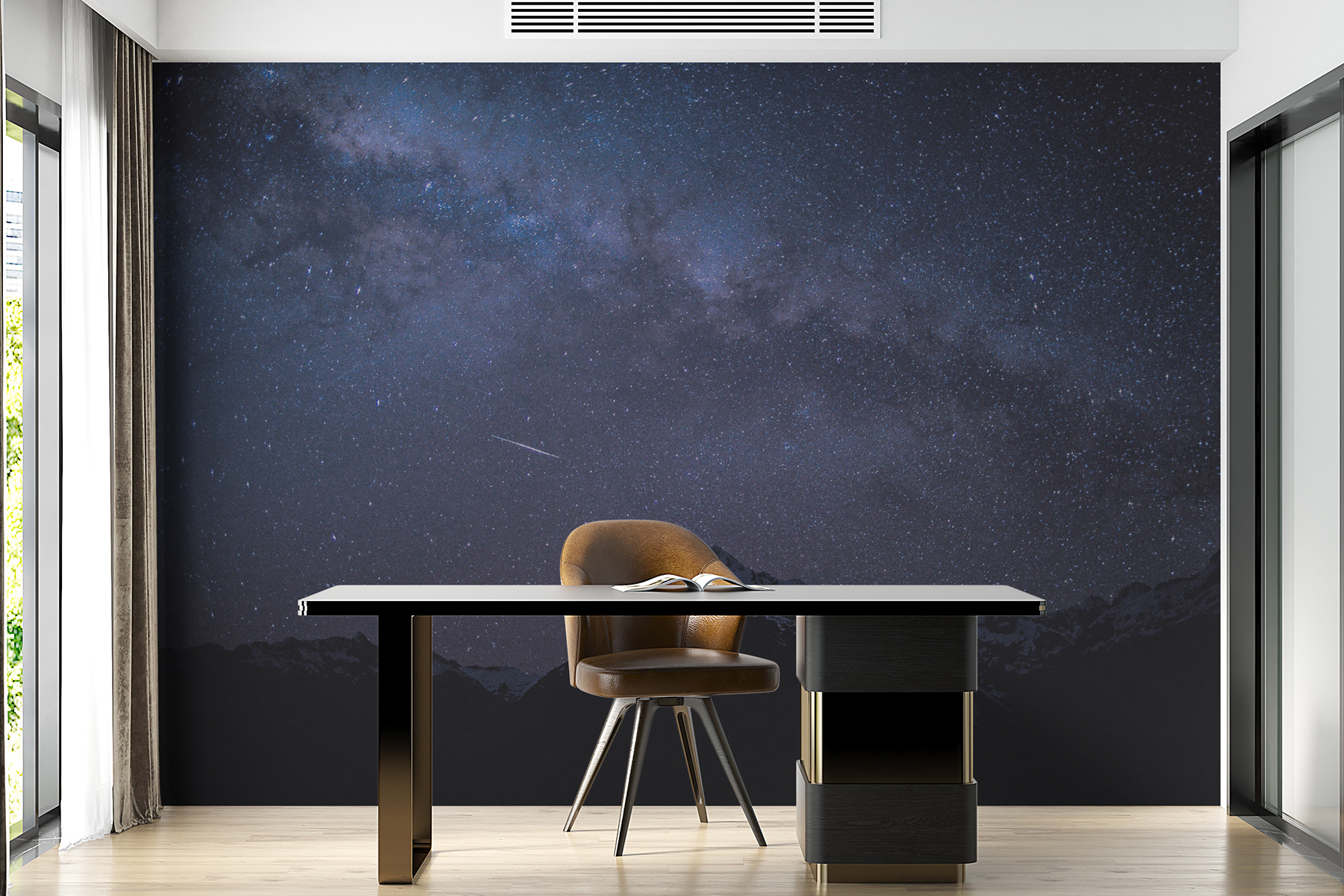 Imagínese entrar en un acogedor refugio donde las montañas escarpadas se encuentran con una pizca de estrellas: ¡sí, esa es la magia de este mural! Transforma su pared en un impresionante paisaje nocturno, invitando a la calma de las montañas a entrar en su espacio. Imagínese un sillón acogedor, tal vez una bebida caliente en la mano, mientras los ojos se desvían hacia los picos que parecen susurrar secretos del universo. Es como tener tu propia escapada, perfecta para soñar despierto o entablar charlas nocturnas. Además, ¿quién no querría impresionar a sus invitados con unas vistas que digan: “Eh, estoy en lo más profundo de las montañas, al menos en lo que a decoración se refiere”? Se trata de crear un ambiente relajado. Perfecto para cualquier rincón: dormitorios, salones o incluso un espacio de trabajo creativo.