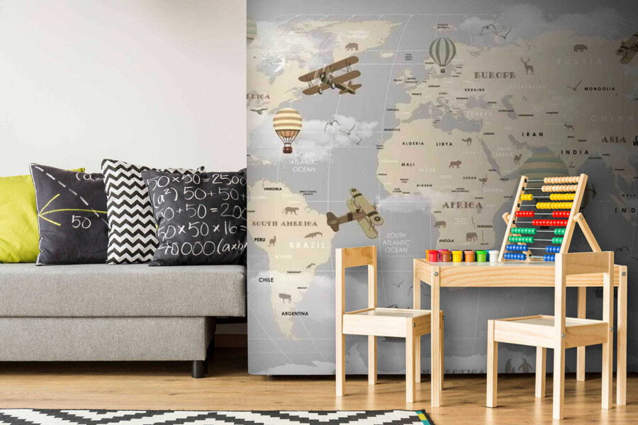Transforma cualquier habitación en un viaje fantástico con el mural «Mapa del mundo con aviones y globos aerostáticos». Imagina entrar en un espacio que despierta la pasión por los viajes con tonos sutiles y evocadores, y diseños divertidos que bailan sobre los continentes. Cada globo y cada avión añaden una pizca de aventura: ¿quién no querría soñar despierto con viajar por el mundo mientras toma un café?