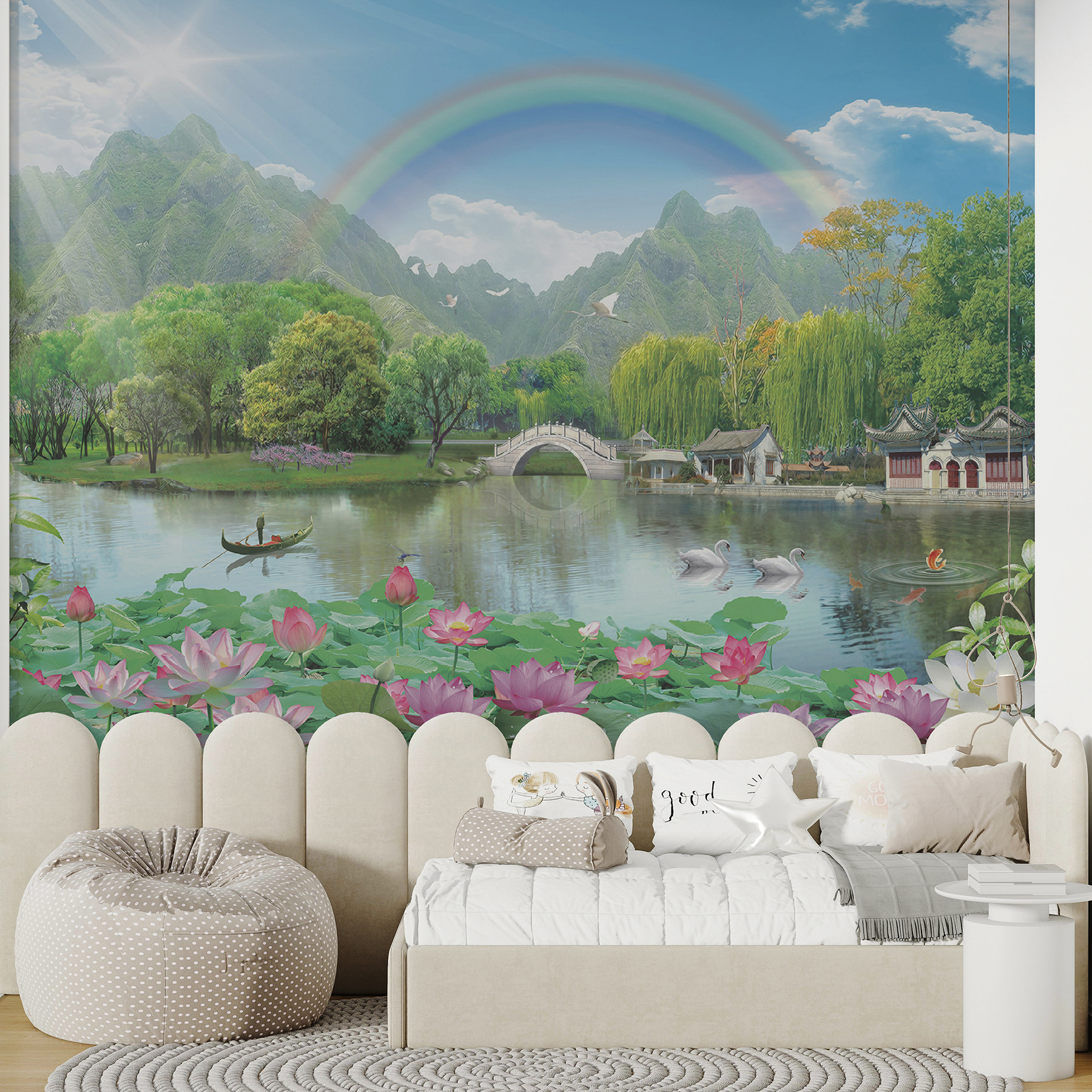 Imagine entrar en una habitación y transportarse a un sereno paraíso junto al lago… ¿Puede sentirlo? Eso es exactamente lo que hace este mural. “Paisaje sereno con flores de loto” es como un suave suspiro para el alma: calmante y tranquilo. Perfecto para guarderías o cualquier espacio que necesite un toque de paz. Imagínese relajándose después de un día ajetreado, disfrutando del suave resplandor del sol poniente, con el aire impregnado del dulce aroma de las flores de loto… Te sentirás de vacaciones todos los días. Además, es un bonito tema de conversación para los invitados (o un fondo perfecto para Instagram). Tanto si decoras la habitación de un bebé como si quieres añadir un toque de naturaleza a tu hogar, este mural te hará sonreír cada vez que lo veas.