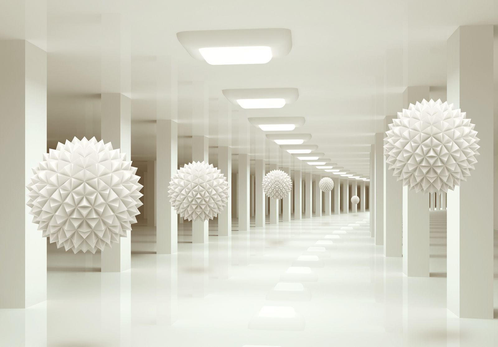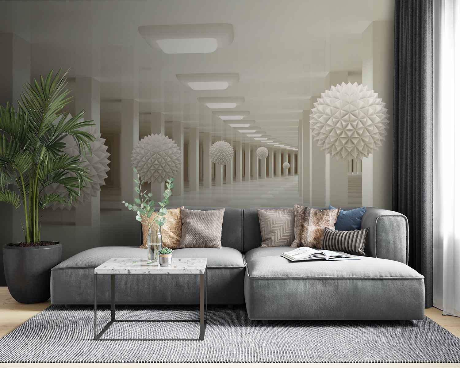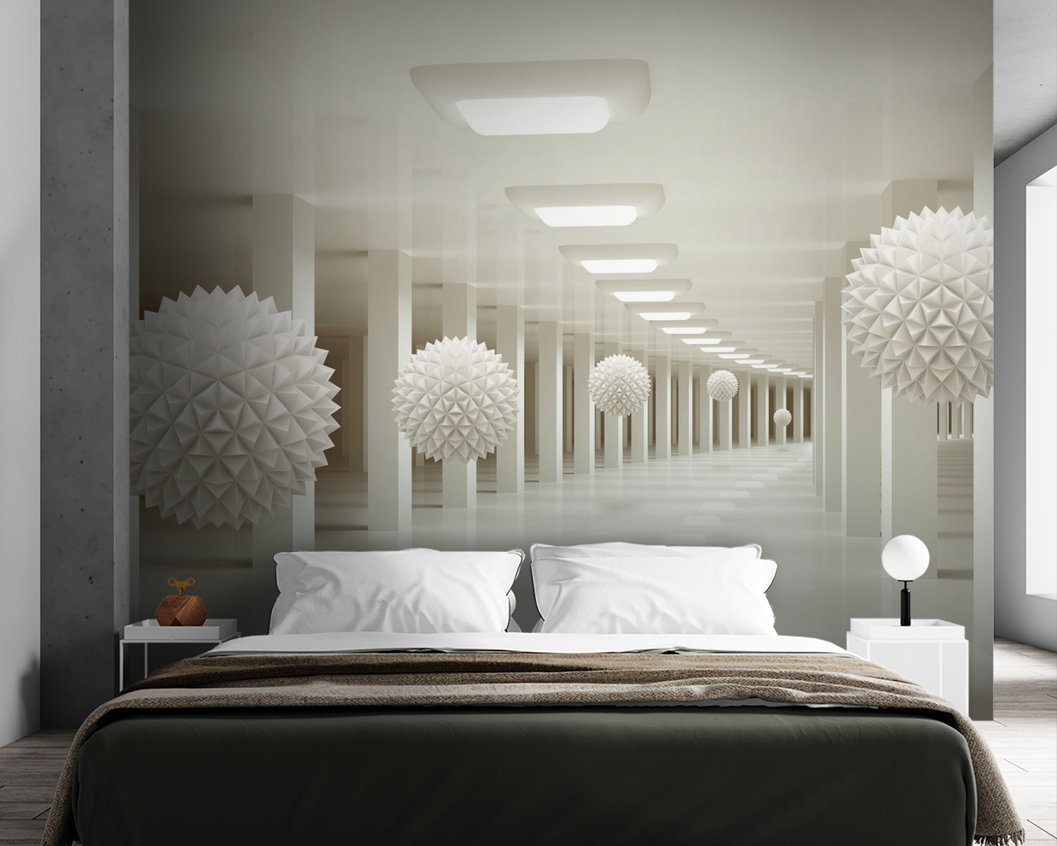 ¿Alguna vez has querido sentirte como en una galería de arte futurista? El “Mural Esfera Blanca con Triángulos” te ofrece exactamente esa sensación. Imagínatelo en tu acogedora sala de estar o en un elegante despacho: un desfile de esferas blancas en 3D flotando serenamente en medio de un país de las maravillas geométricas. Es como entrar en otra dimensión.