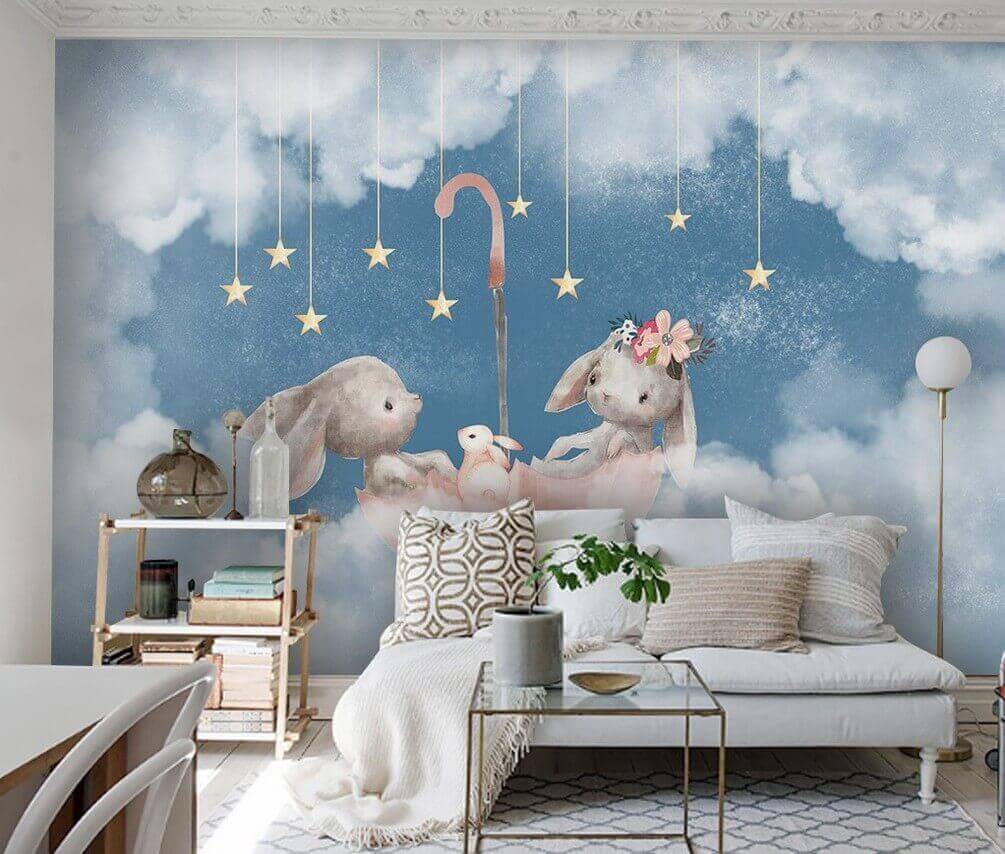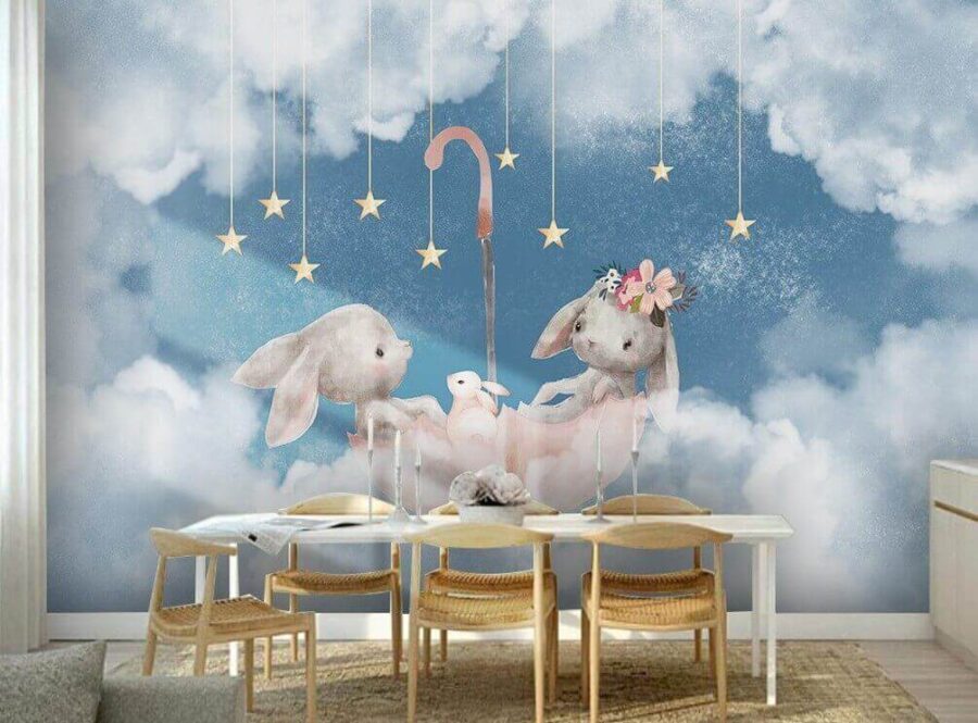 Transforma tu espacio con el encantador encanto de «Dos conejos bajo un paraguas rosa». Este encantador mural aporta un toque divertido y caprichoso a cualquier estancia, con adorables conejitos flotando entre nubes de ensueño, unidos por un paraguas rosa brillante. Es como un suave abrazo para tus paredes, perfecto para alegrar una habitación infantil, una sala de juegos o incluso ese acogedor rincón de lectura. Imagina tomarte un té con este mural como telón de fondo: ¿quién no sonreiría? Es como un pequeño pedazo de magia que despierta la alegría. Los colores suaves y los detalles dulces invitan a soñar despierto y a reír, haciendo que cada mirada sea una pequeña escapada.