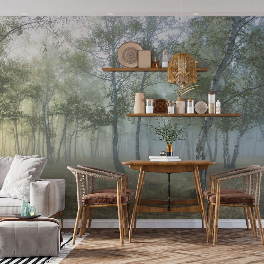 Imagínatelo: entras en una habitación y ahí está: un bosque sereno, con ese resplandor matutino perfecto y brumoso que parece sacado de un sueño. Bienvenido a “Amanecer brumoso en un bosque tranquilo”. Es como entrar en tu propio refugio privado en el bosque. Imagínate empezar el día con una taza de café, contemplando este mural y sintiendo cómo te invade la calma.