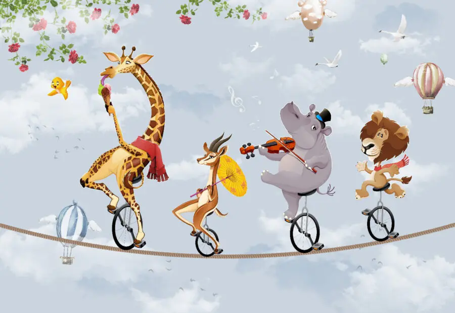 Transforma el espacio de cualquier niño con este encantador mural en el que aparece un hipopótamo dando una serenata a todo el mundo con un violín. Imagina la alegría de ver a una jirafa y un león, ambos en monociclo, uniéndose a la diversión. Es una escena caprichosa que despierta la imaginación y la risa. Ideal para dormitorios o zonas de juego, este mural puede alegrar fácilmente cualquier pared aburrida, dándole un toque de carácter. Imagínese a los más pequeños riendo mientras se lanzan a la aventura cada día: ¿quién no querría despertarse con ese alegre caos? Es el toque perfecto para inspirar creatividad y alegría.