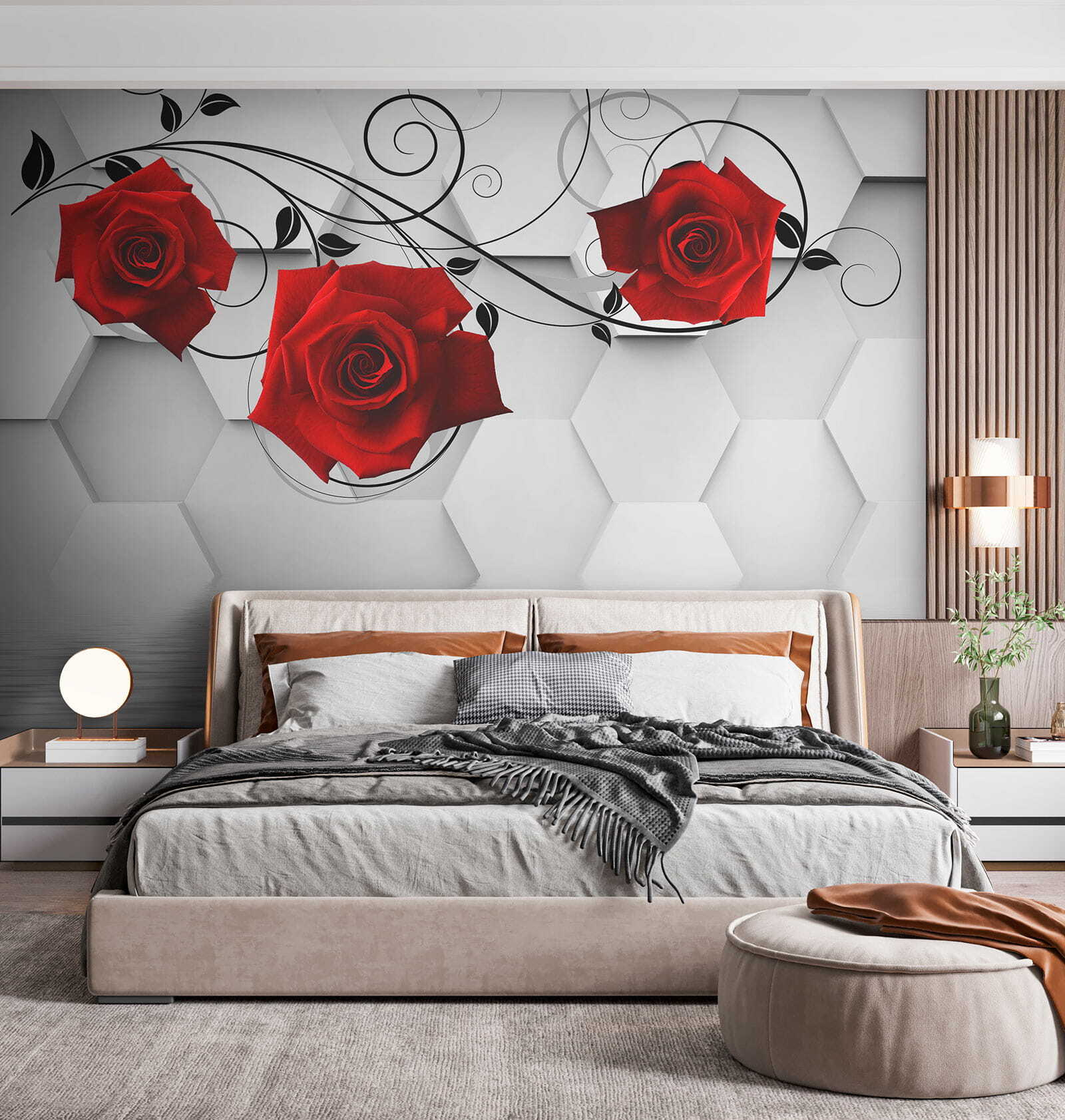 Transform your space with this stunning wall mural featuring vibrant red roses gracefully intertwined with elegant black vines. It’s like having a blooming garden right in your living room, minus the watering can and occasional bee buzz. The backdrop of sleek hexagons keeps things modern, while those roses add a touch of romance—perfect for creating a cozy atmosphere. Whether it’s a lazy weekend morning coffee or a lively dinner party, this mural sets the mood just right. It’s the kind of decor that sparks conversations and maybe a few daydreams about secret gardens. Who wouldn’t feel a bit more inspired staring at those beauties?