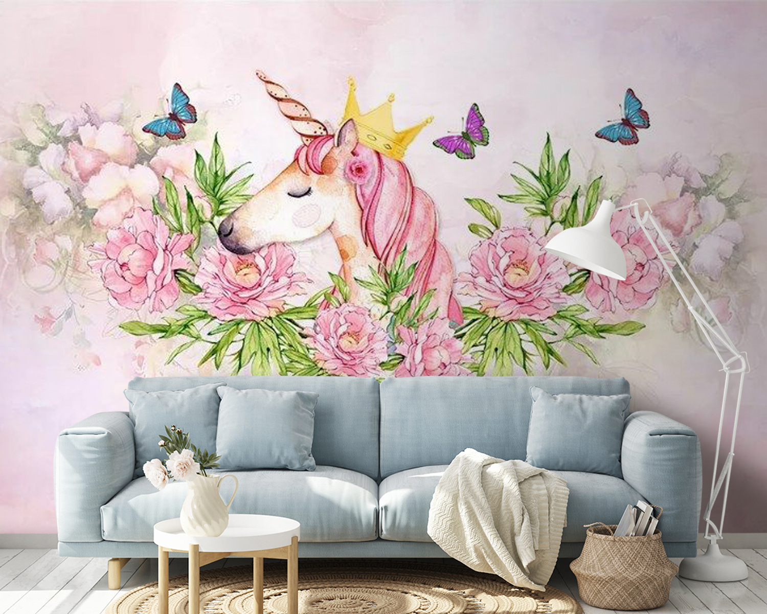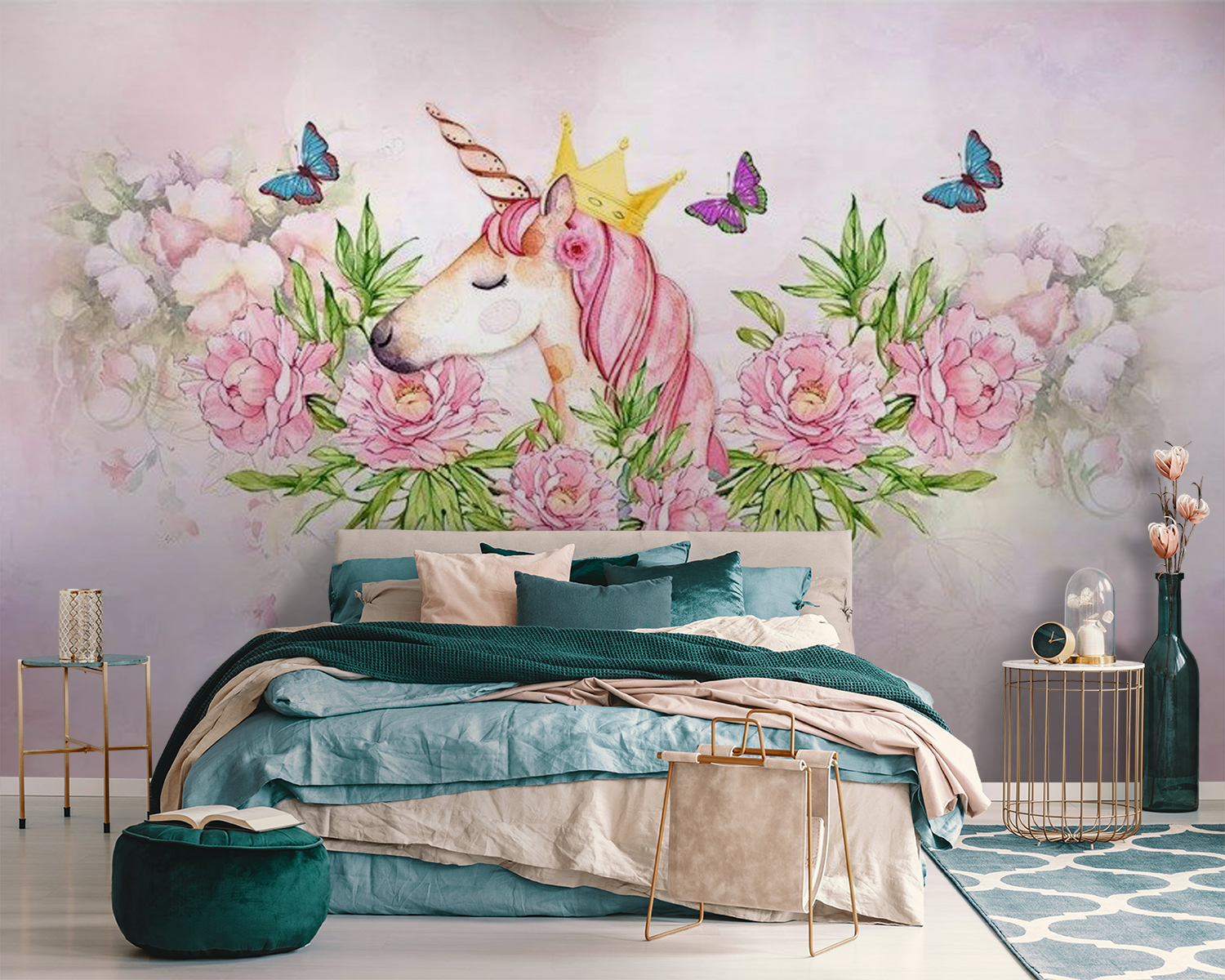 Transforme el espacio de un niño en un reino mágico con este encantador mural de pared con un unicornio coronado y rodeado de mariposas. Imagine el deleite en los ojos de su hija cuando entre en su habitación y sea recibida por esta caprichosa escena. Es como si un cuento de hadas cobrara vida en las paredes. Los colores suaves y el encantador diseño crean una atmósfera serena y vibrante a la vez. Imagínate acogedores momentos a la hora del cuento o juegos en los que la imaginación puede volar, ¡no necesitas zapatos brillantes cuando este mural aporta toda la magia! Perfecto para cualquier pequeño soñador.