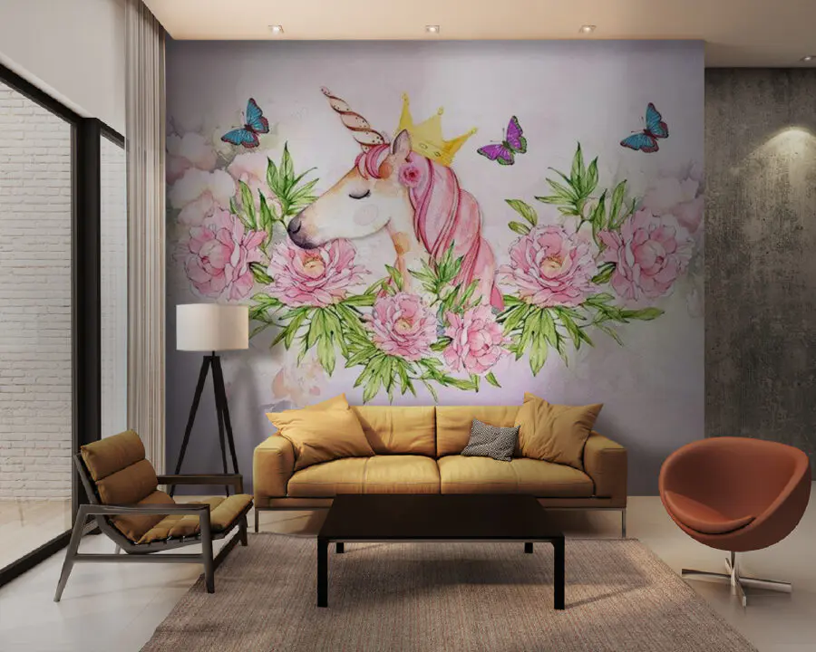 Transforme el espacio de un niño en un reino mágico con este encantador mural de pared con un unicornio coronado y rodeado de mariposas. Imagine el deleite en los ojos de su hija cuando entre en su habitación y sea recibida por esta caprichosa escena. Es como si un cuento de hadas cobrara vida en las paredes. Los colores suaves y el encantador diseño crean una atmósfera serena y vibrante a la vez. Imagínate acogedores momentos a la hora del cuento o juegos en los que la imaginación puede volar, ¡no necesitas zapatos brillantes cuando este mural aporta toda la magia! Perfecto para cualquier pequeño soñador.