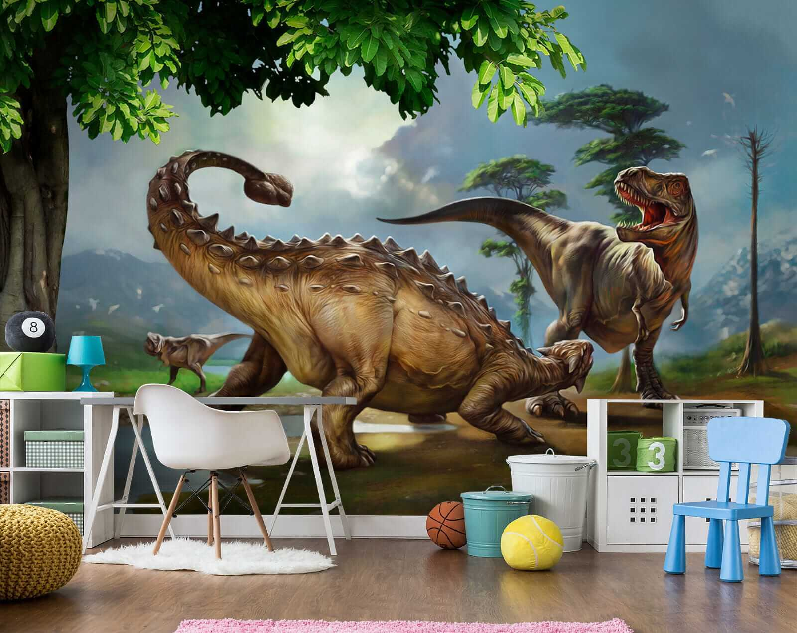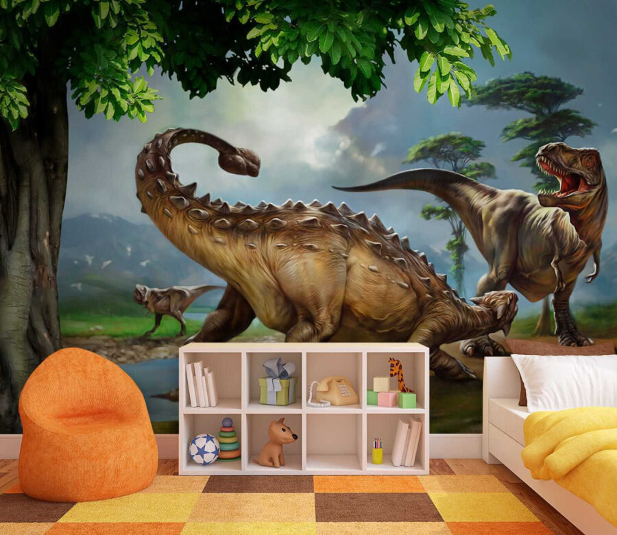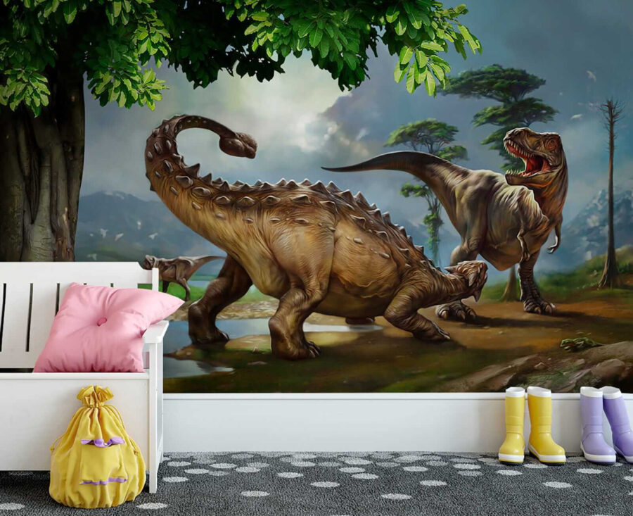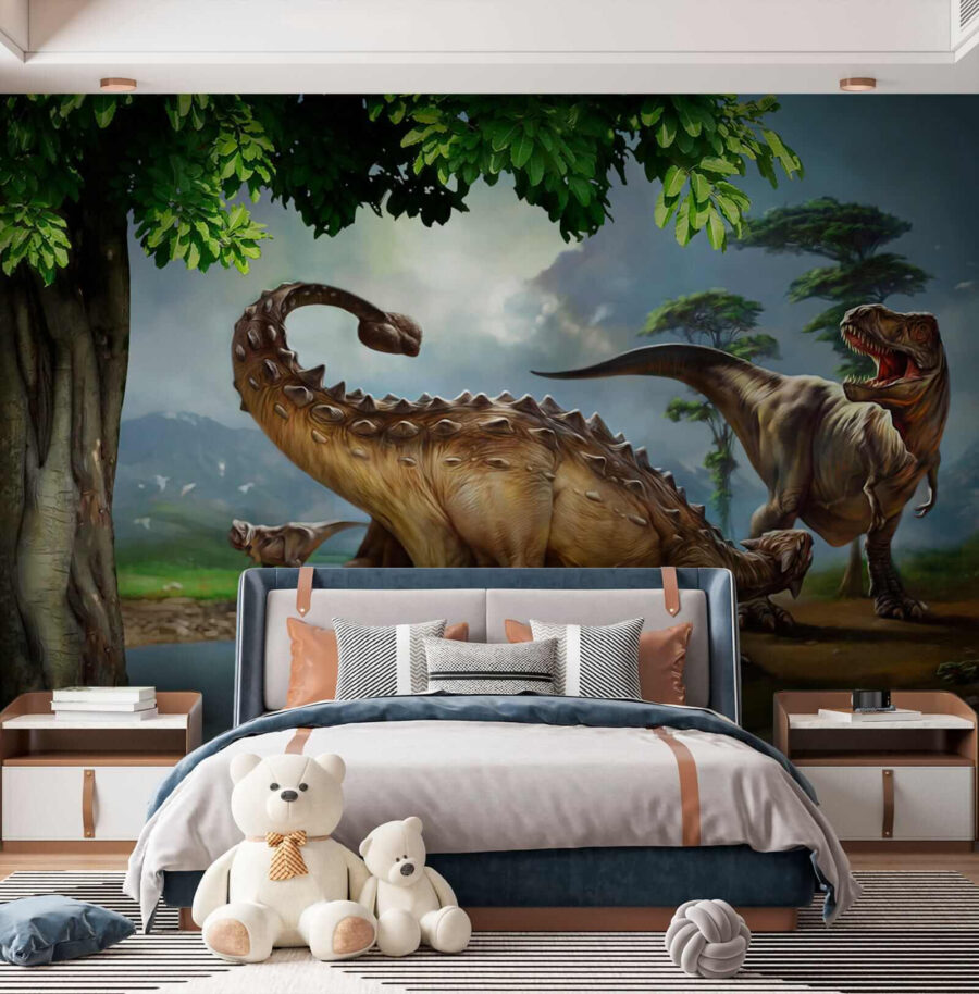Imagínese que entra en una escena de una superproducción de dinosaurios: ¡este mural es exactamente eso! Con un dinosaurio de gran tamaño con largos cuernos y una cola que parece barrer toda la pared. A los niños les encantará porque, admitámoslo, los dinosaurios son simplemente geniales. Y no es sólo para los niños. Cualquiera que adore un toque de aventura prehistórica en su decoración encontrará en este mural un éxito rotundo. Es como tener tu propio oasis jurásico en casa, sin el ruido de las pisadas… ¡uf! Perfecto para dormitorios, salas de juegos e incluso estrafalarios salones. Con colores vibrantes y detalles increíbles, es casi como retroceder al Cretácico. ¿Alguien quiere viajar en el tiempo? Convierte tu espacio en un tema de conversación y deja que esos antiguos paisajes y criaturas despierten la imaginación y el asombro cada día.