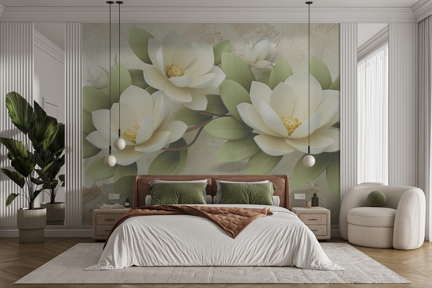 El efecto 3D de este mural realmente destaca, añadiendo profundidad y vida a sus paredes; sinceramente, casi da la sensación de que puede extender la mano y tocar los pétalos. Además, ¿esas suaves hojas verdes? Simplemente relajantes. Imagínate colocarlo en el salón o en el dormitorio… ¡o incluso en el pasillo! La gente entraría y sentiría al instante ese ambiente relajante y elegante.