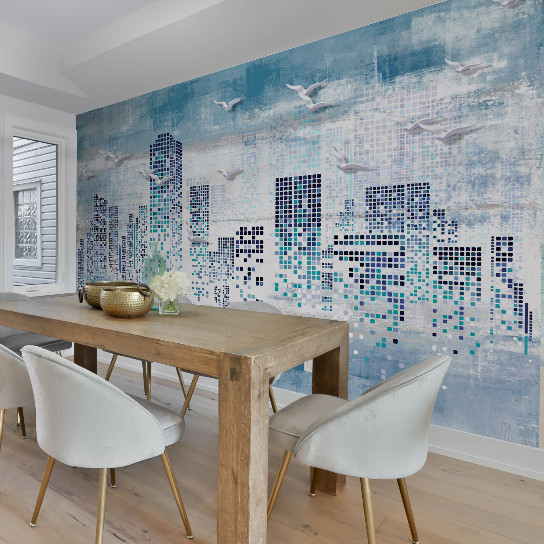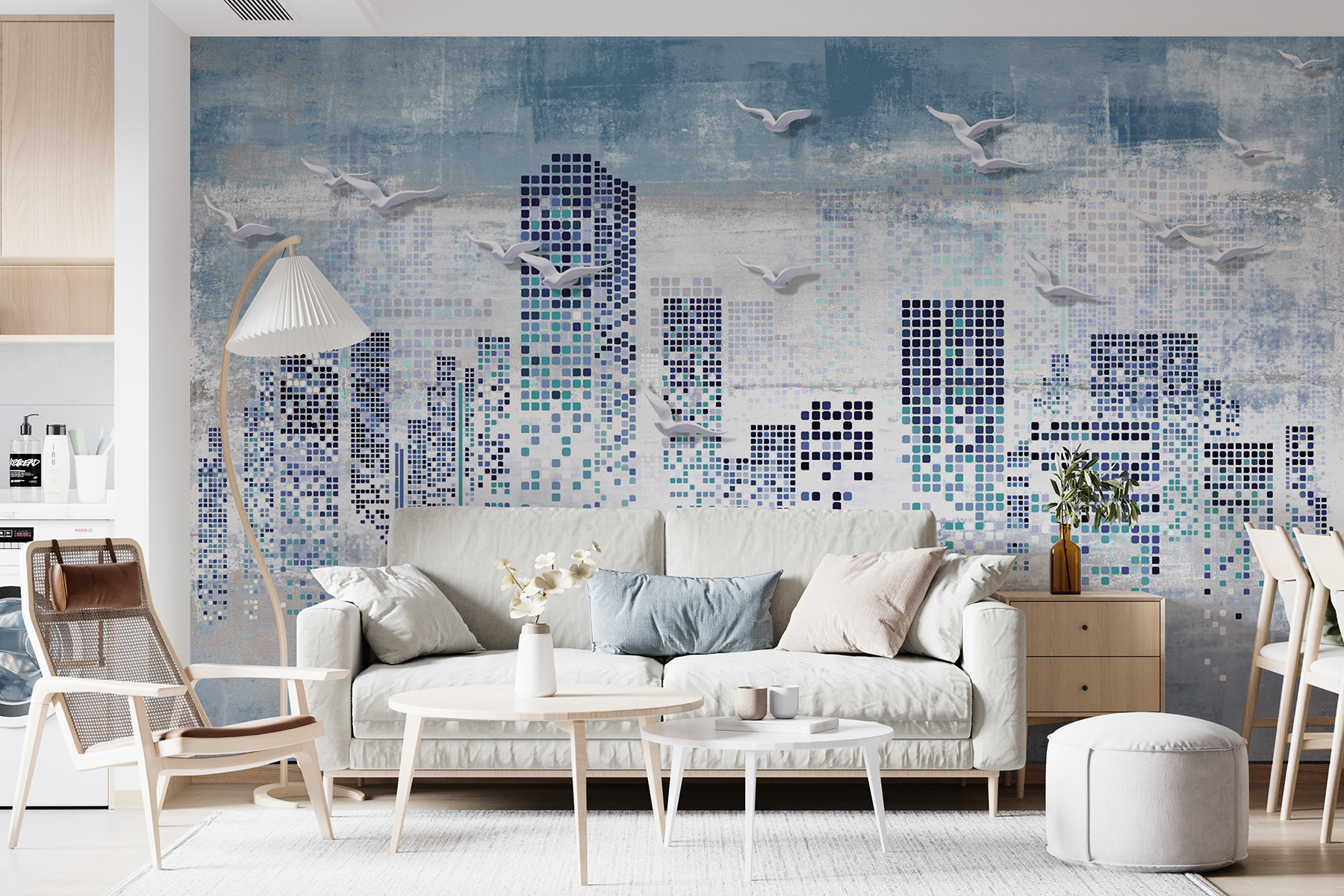 Imagínese sobrevolando un paisaje urbano cada vez que entre en su habitación. Este mural “Pájaros volando sobre una ciudad” aporta un toque de fantasía y sofisticación a cualquier espacio. Perfecto para niños, adolescentes e incluso adultos con un corazón joven. El genial diseño geométrico en 3D añade profundidad, mientras que los colores serenos hacen que parezca una aventura de ensueño. ¿Se lo imagina? Gaviotas planeando a través de un horizonte abstracto y pixelado; es como una obra maestra de la combinación de lo digital y la naturaleza. Ideal para alegrar la habitación de un adolescente o añadir un toque de elegancia urbana, ¡sin todo el ruido! Siéntese, relájese y deje volar su imaginación…