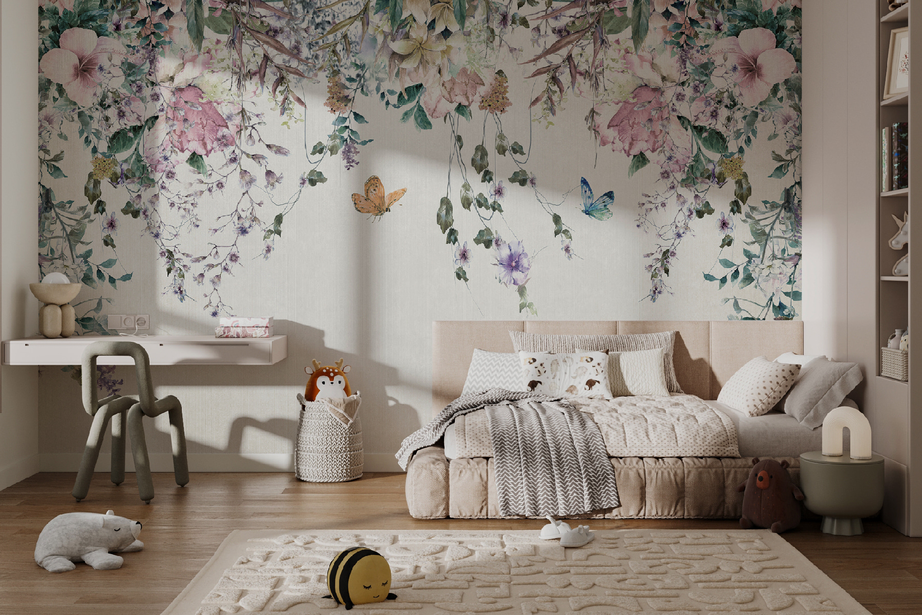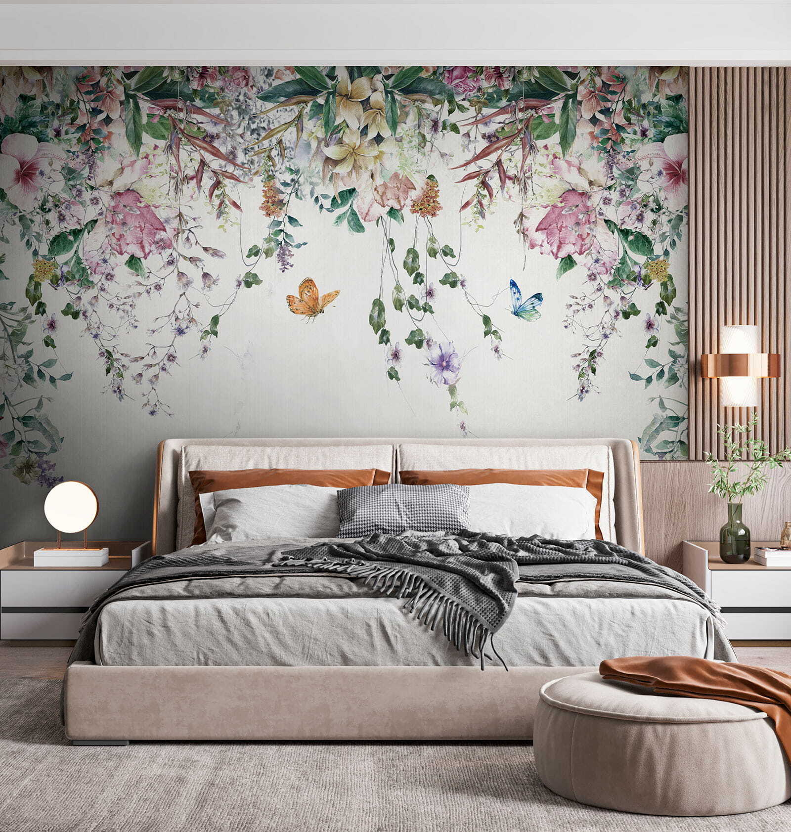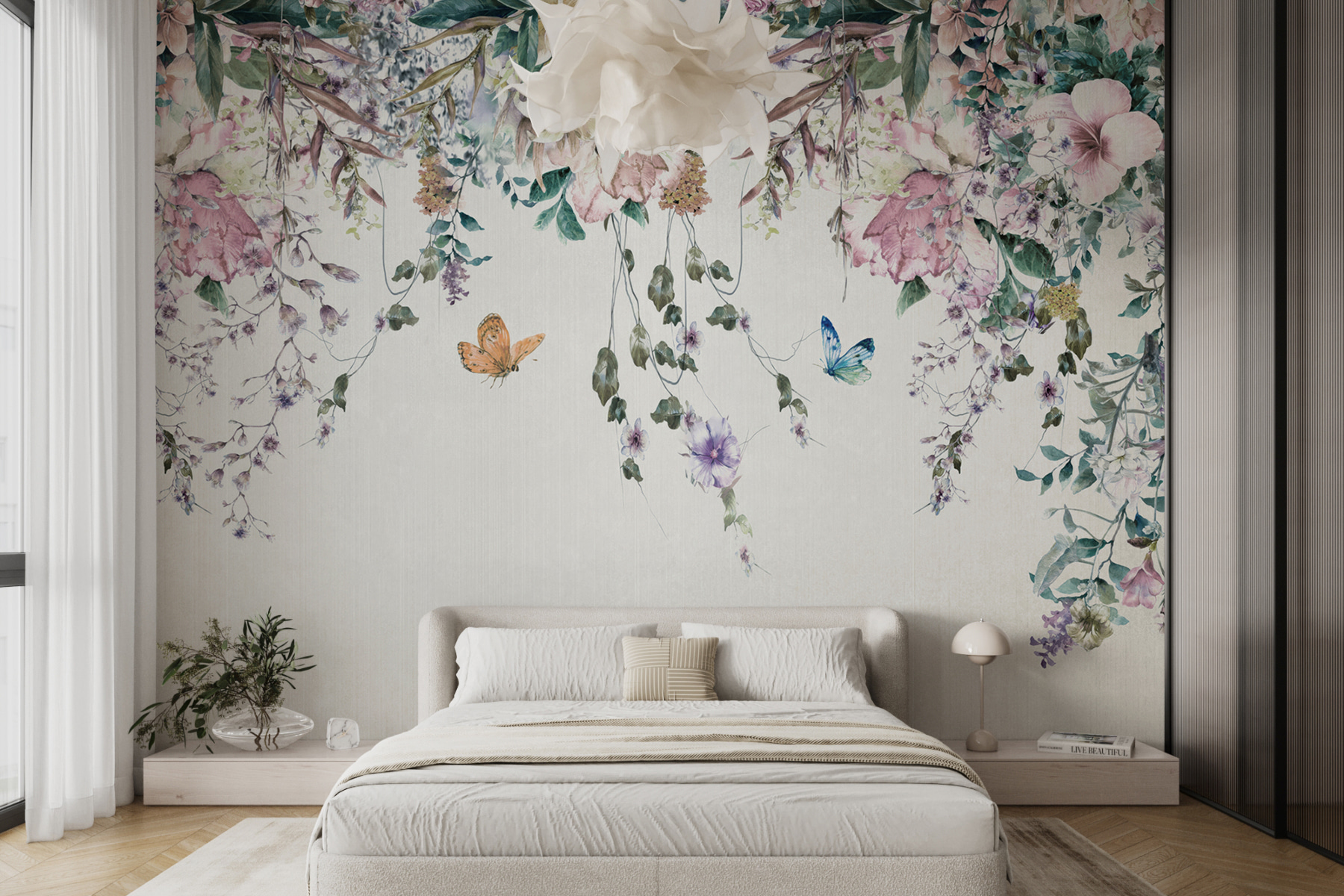 Este mural no es sólo decoración, es un estado de ánimo. Imagínate relajándote después de un largo día, rodeado de flores y mariposas flotantes… ¿tranquilo, verdad? Es como tener tu trocito de paraíso personal. ¿Por qué esperar? Deje que sus paredes cuenten una historia de elegancia y encanto.