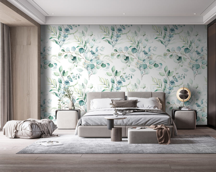 Transformar un espacio con este mural de hojas y ramas es como llevar un pedazo de naturaleza al interior de tu hogar. Imagínate de pie en tu salón, rodeado de una relajante mezcla de verdes y azules sutiles. Es como una brisa fresca que sopla, ¡pero sin insectos! Perfecto para rincones de lectura o comedores acogedores, este diseño transmite tranquilidad.