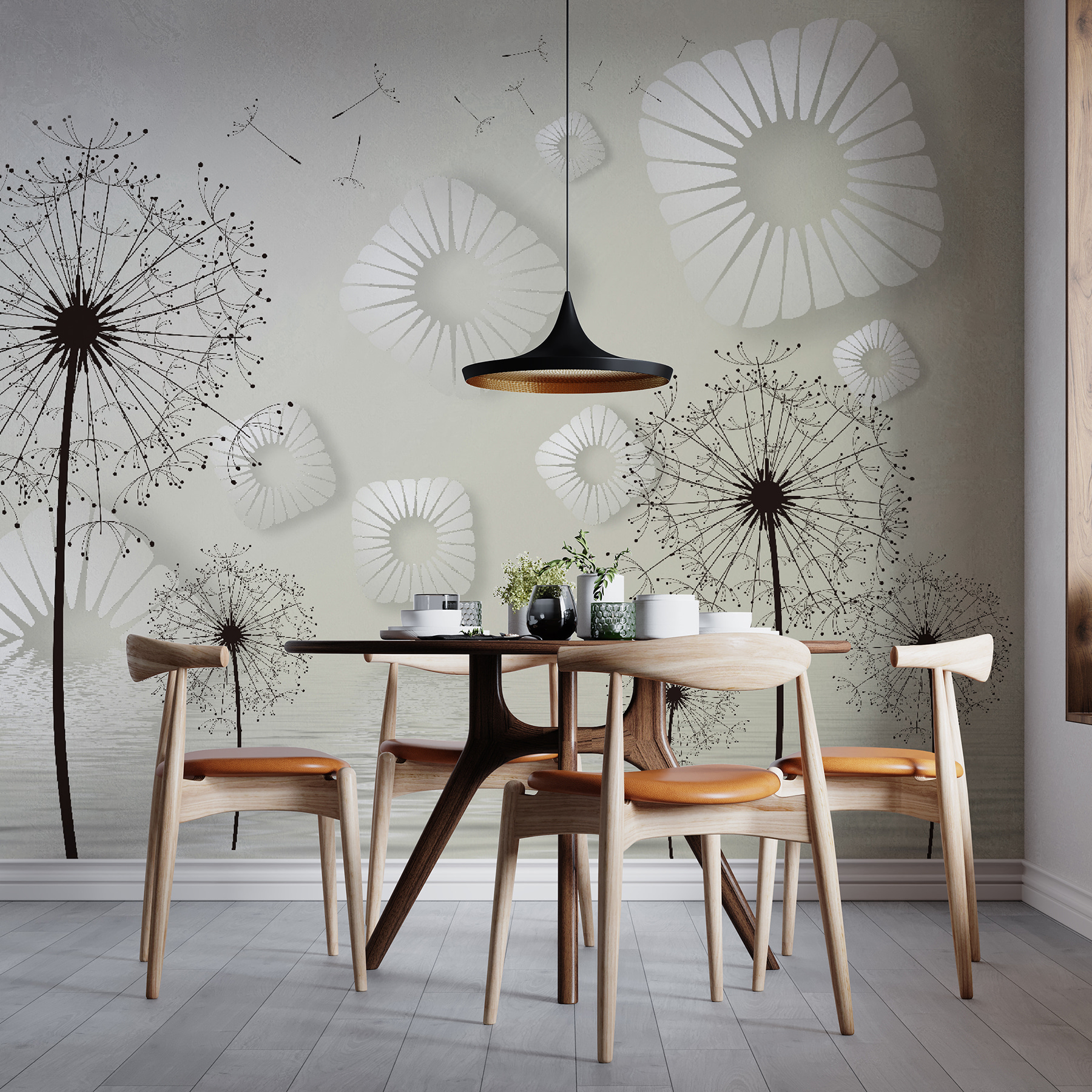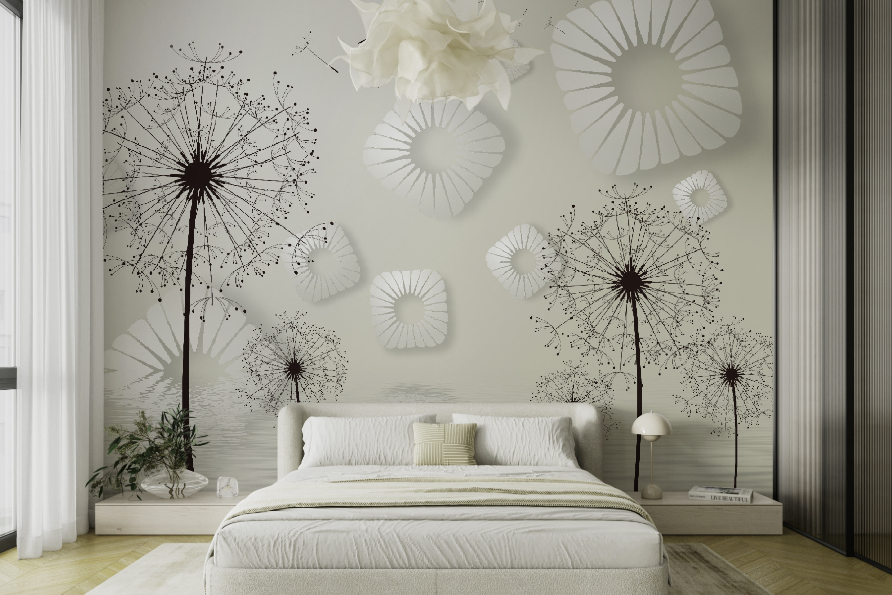 Transformar un espacio puede parecer mágico, y este mural de pared capta esa sensación a la perfección. Imagínese que entra en una habitación pintada con delicados dientes de león, cuyas encantadoras y tenues formas invitan a soñar despiertos y a la fantasía. Los diseños circulares blancos flotan como nubes, añadiendo un toque ligero y aireado que resulta fresco y acogedor.