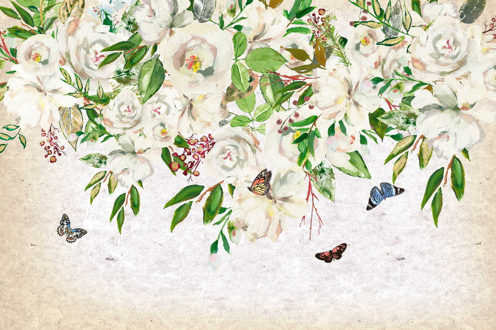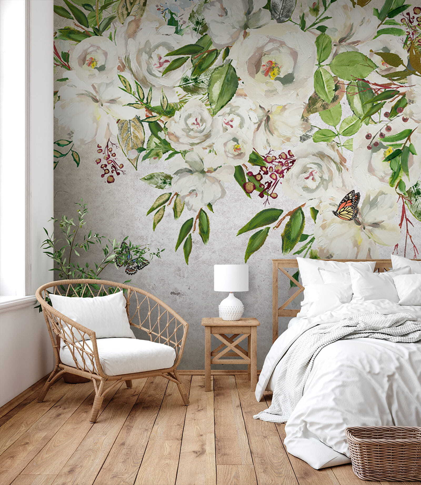 Transforma tu espacio con este encantador mural de flores blancas y mariposas revoloteando. Es como entrar en un jardín secreto sin los molestos insectos, ¡a menos que cuentes estas encantadoras mariposas! Imagínate esto: suaves pétalos y verdes vibrantes cubriendo tus paredes, trayendo una suave brisa de naturaleza a tu hogar. Este mural susurra tranquilidad, perfecto para un rincón de lectura acogedor o un dormitorio sereno. Imagina acurrucarte con un buen libro, rodeado de la atmósfera relajante de esta obra de arte. No es solo decoración, ¡es una experiencia que espera florecer! Deja que tus paredes cuenten una historia.