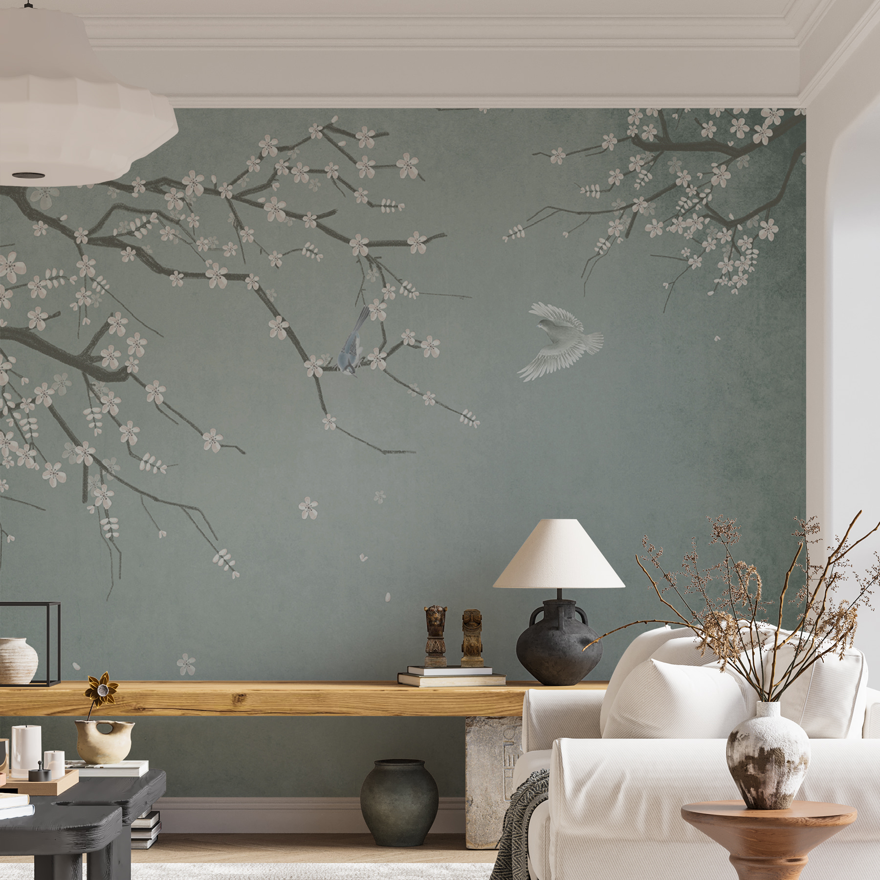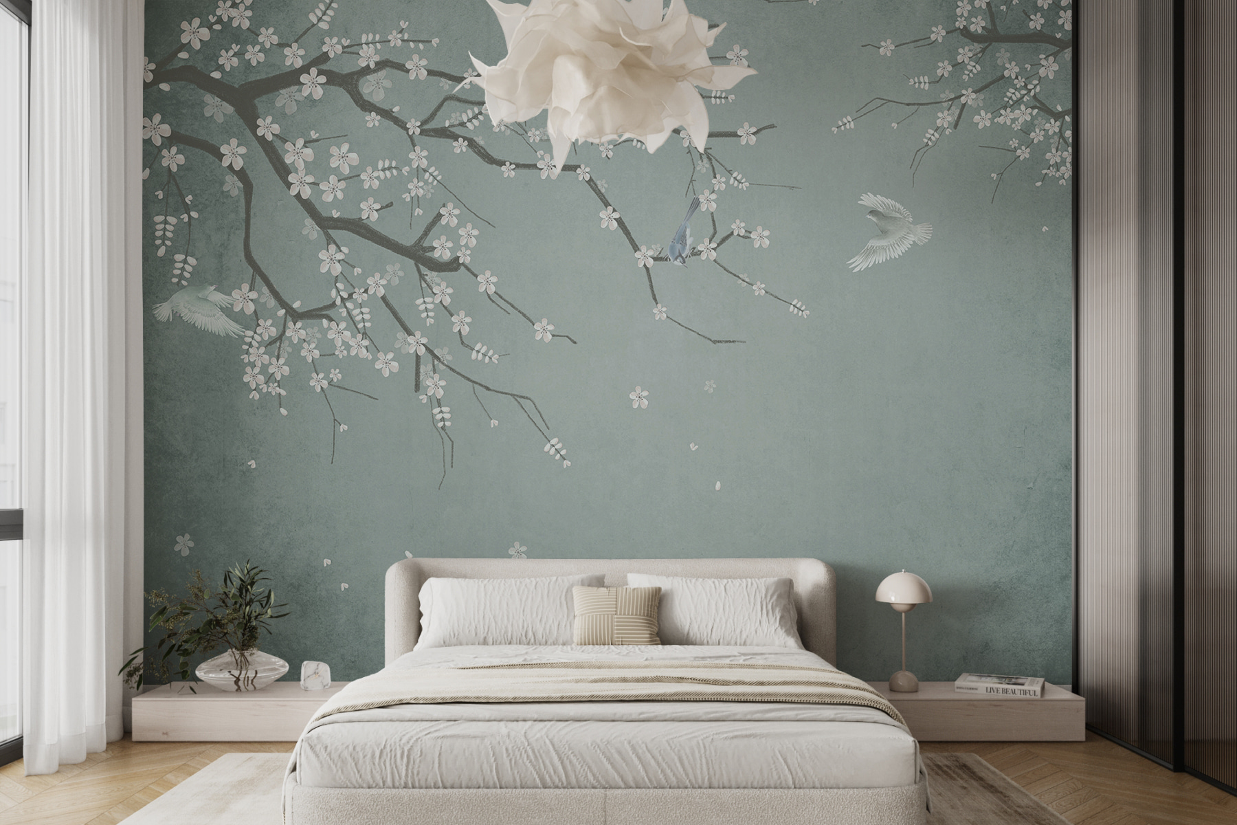 Imagínese entrar en una habitación donde la paz se une con el arte: ¡”Pájaros y flores en serena armonía” hace exactamente eso! Imagínese delicadas flores de cerezo y pájaros mezclándose en su pared, creando un pequeño trozo de paraíso. Es como llevar el suave susurro de la primavera al interior.