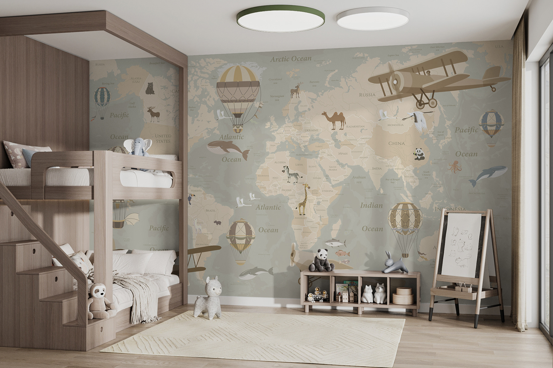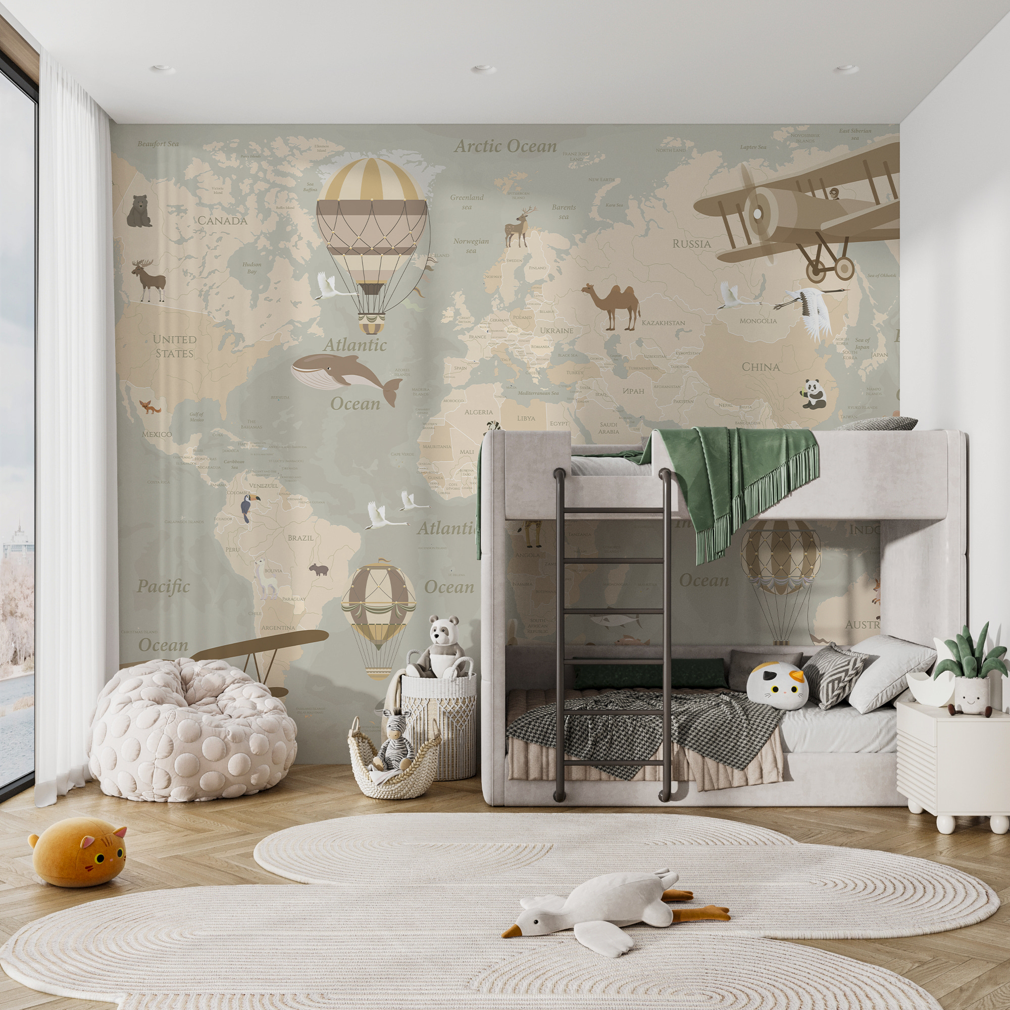 Imagina a tu pequeño explorador embarcándose en aventuras imaginarias: un día volando en un biplano sobre África y al siguiente flotando en un globo aerostático sobre Australia. Es perfecto para despertar la curiosidad y convertir las paredes en un lienzo de sueños. Además, tiene un encantador aire vintage que los adultos también pueden apreciar, como si fuera una obra de arte y una lección de geografía a la vez. Caprichoso y educativo a la vez, convierte cada mirada en unas minivacaciones. Así que, ¿por qué conformarse con paredes lisas cuando puedes tener todo un mundo esperando a ser explorado?