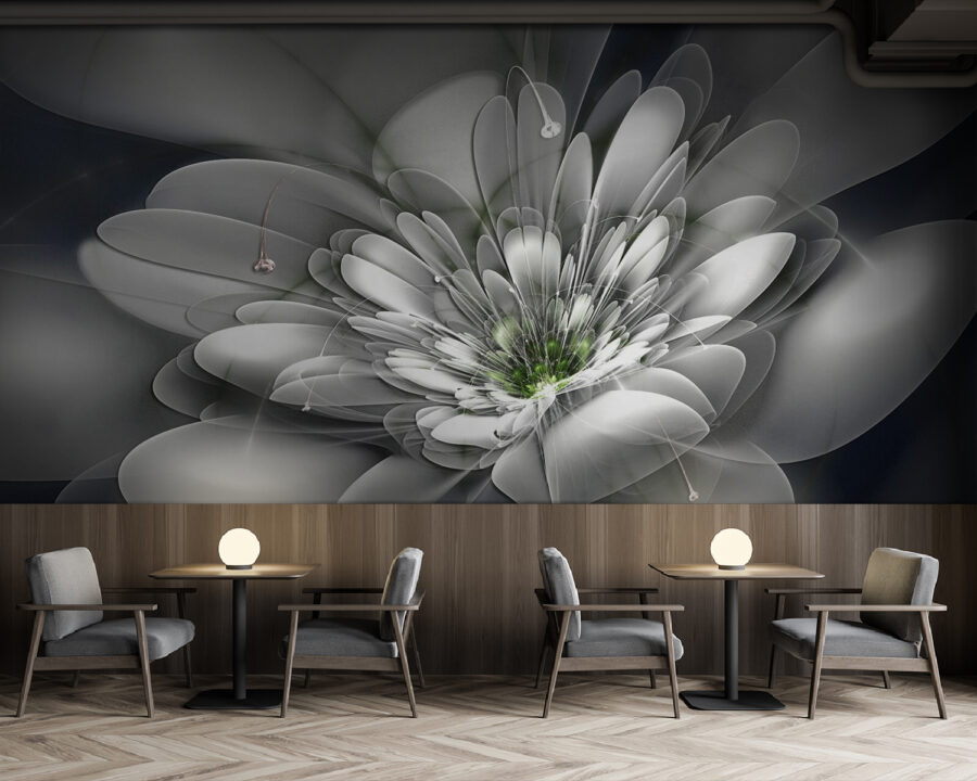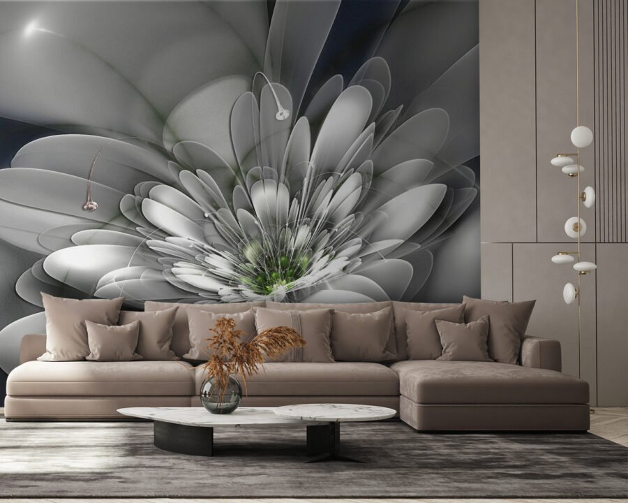 Imagínese entrar en una habitación que al instante se sienta más ligera, como un soplo de aire fresco. Este mural de pared, con una llamativa flor blanca con un vibrante centro verde, es justo lo que necesita. Sus suaves tonos y elegantes curvas invitan a una sensación de calma y serenidad, perfecta para un rincón acogedor o una animada sala de estar.